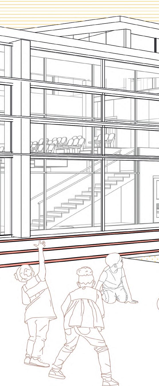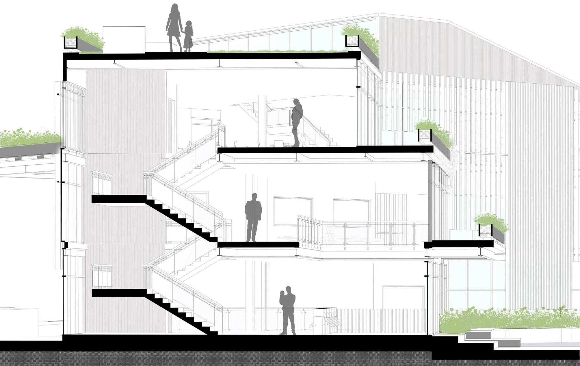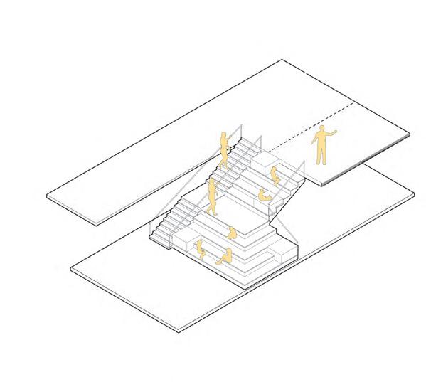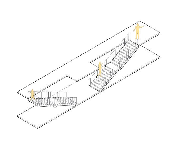 To achieve a multi-proposal distributive space, the vertical circulation was modified by changing the composition of the stairs, these ones were enlarged in the transversal direction and extrude to allow a wider hallway and better circulation across the building. The stairs also allow staying areas to enhance the comon spaces as learning and recreative areas.
