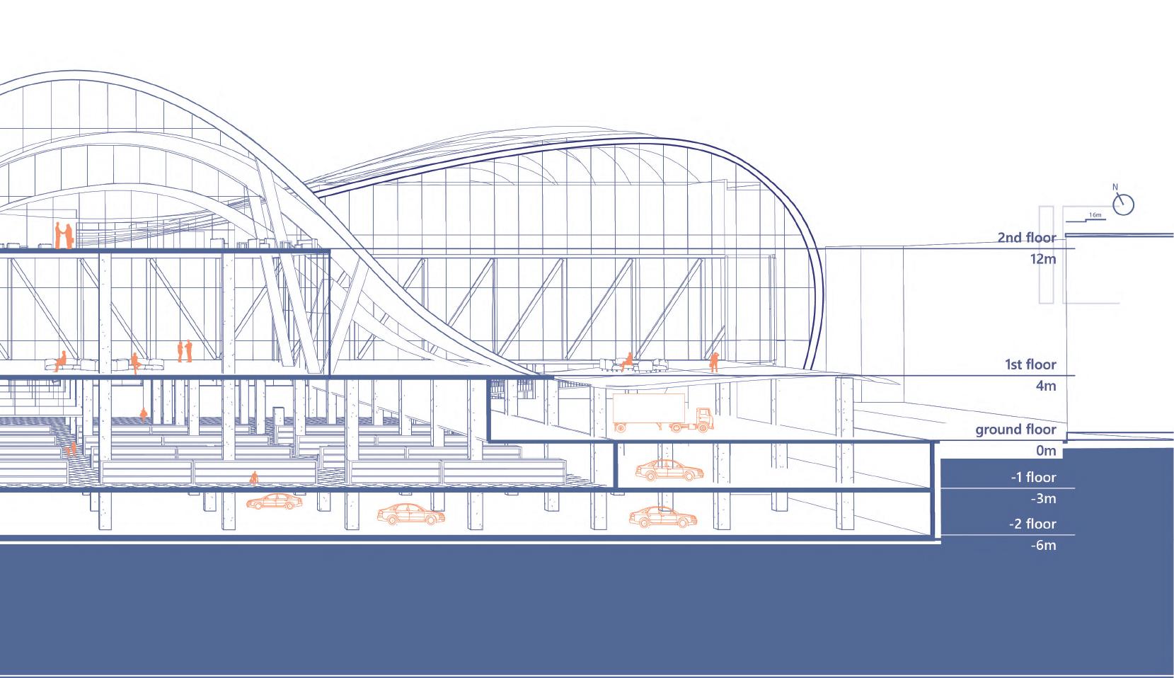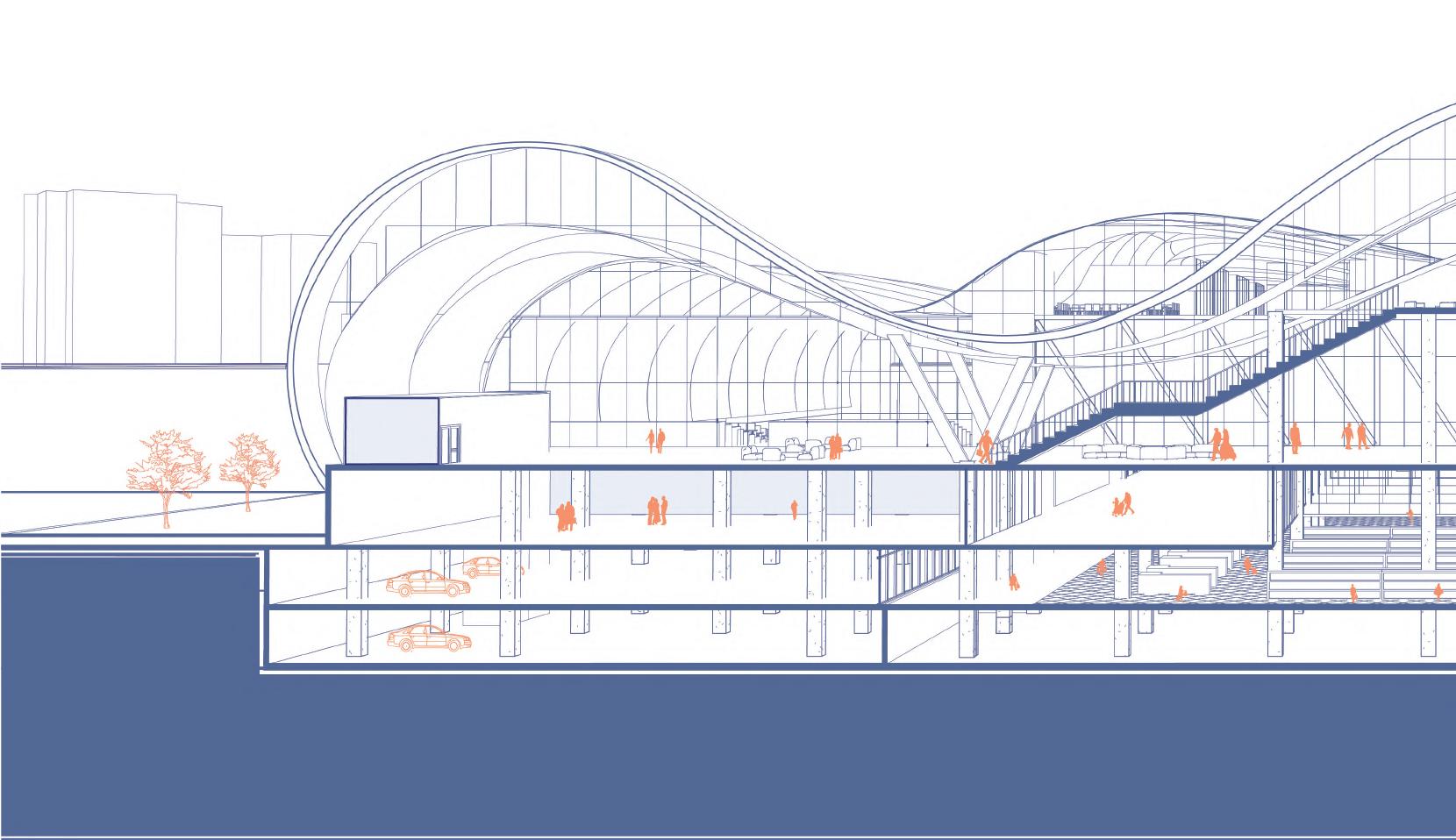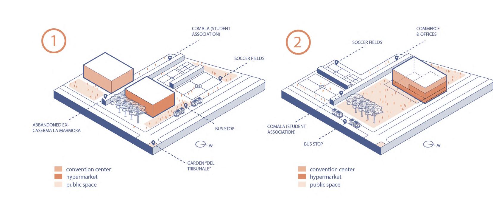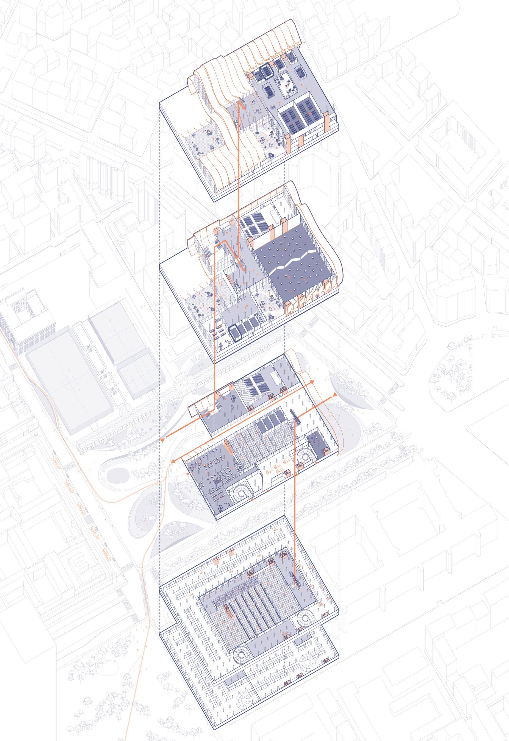 In Turin, one of the most important axes of the city will be found along the spina 2 which generates different flows due to the proximity of a variety of activities around the area. The project, whose main functions will be a hypermarket and a convention center, concentrates itself in a big area surrounded by nodes such as the porta susa station, tand the Politecnico di Torino. The parameters taken into account for designing the buildings and the landscape were obtained from flows and intensities given by the uses, actors and the current occupied areas from the site.