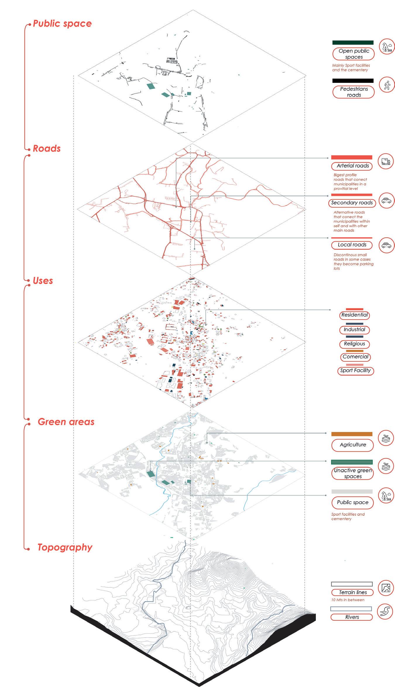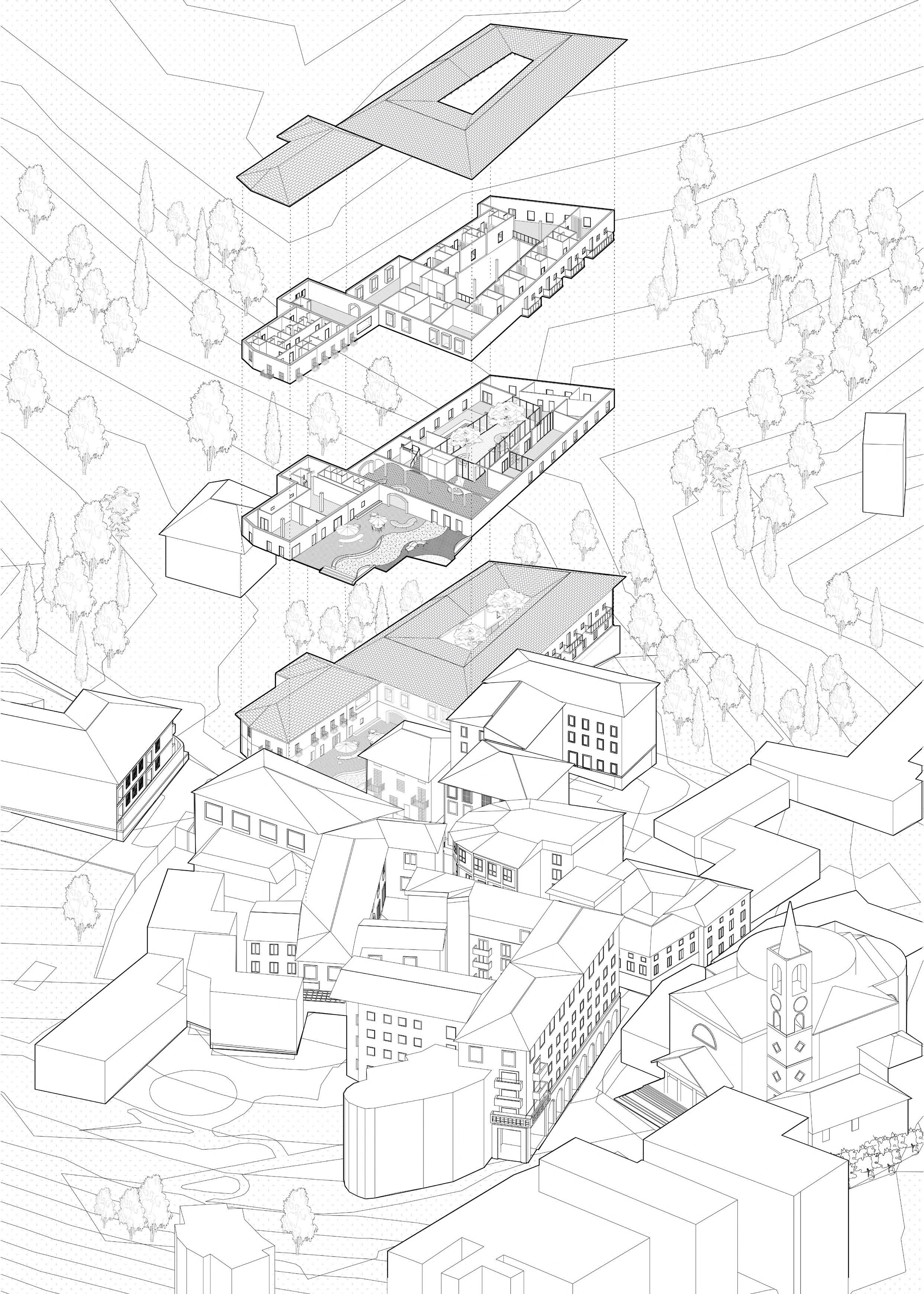 The architectural program directly integrates a residential project for the elderly population and commercial and recreational uses for the whole community. For this reason the circulations and spaces are thought for all people including those with reduced mobility managing careful transitions from main public areas to private ones. However, one of the main challenges was to work with the hilly topography that shapes the center of the town.