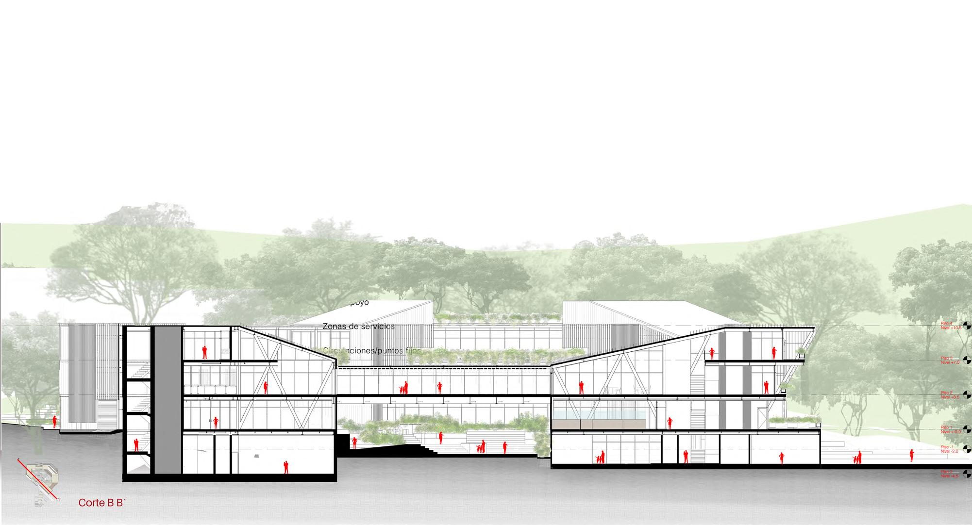 The María Cano Women’s Support and Capacitation Center, located in Lourdes, is a hybrid building, since the facility itself forms and shapes the public space. For placing the project, a strategic space is sought where relationships, both urban and environmental, allow the development of a building of a high range of influence and scale. The presence of water flows generates the axes that define the visuals of the project.