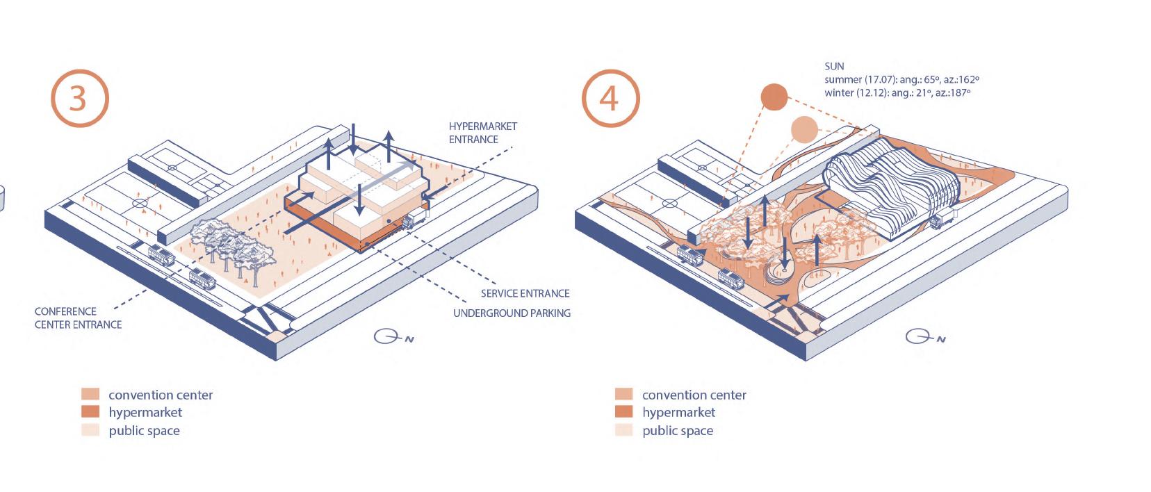 In this way, it was decided to combine both main uses of the project (hypermarket and convention center) to give the amount of public space deserved and needed in this area of the city.