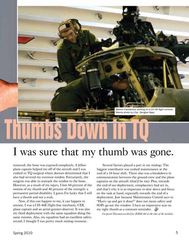 I was sure that my thumb was gone. removed; the bone was exposed completely. A fellow plane captain helped me off of the aircraft and I was rushed to TQ surgical where doctors determined that I also had severed my extensor tendon. Fortunately, the surgeon was able to reattach the tendon to the bone. However, as a result of my injury, I lost 60 percent of the motion of my thumb and 40 percent of the strength: a permanent partial-disability. I guess I’m lucky that I still have a thumb and not a stub. Now, if this can happen to me, it can happen to anyone. I was a CH-46E flight-line mechanic, CDI, plane captain and an aerial gunner-observer. It was also my third deployment with the same squadron doing the same mission. Also, my squadron had an excellent safety record. I thought I was pretty much mishap-immune.