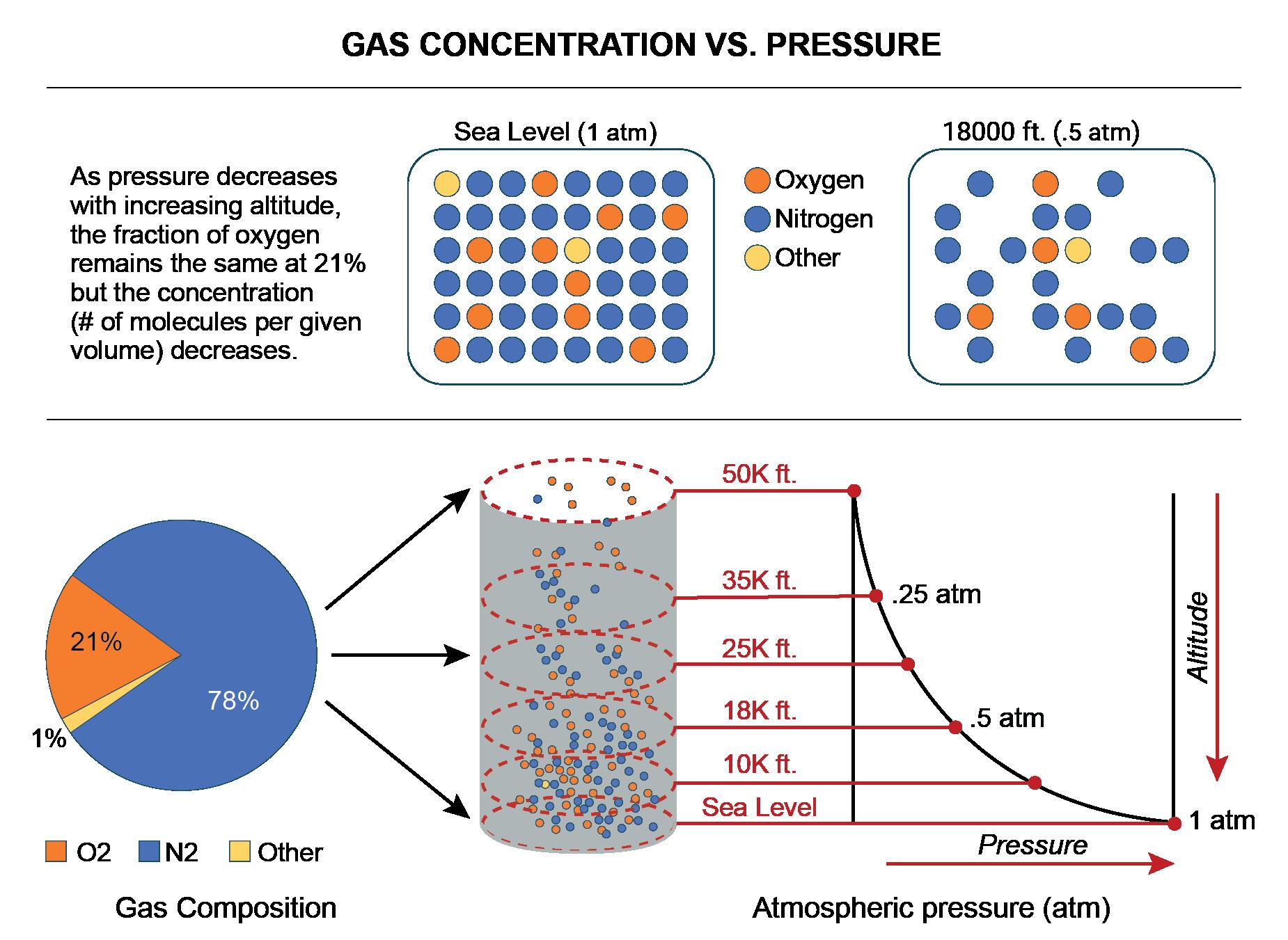 For the purposes of this discussion at altitudes most relevant to naval aviation, the composition of air at sea level is about the same as it is at higher altitudes in the atmosphere. There is approximately 21% oxygen and 78% nitrogen with other gases such as carbon dioxide, argon, helium and neon making up the remaining 1%. As you ascend in the atmosphere, the total pressure for all gases combined decreases (figure 1). The pressure at sea level is 1013.25 millibars (or around 14.7 psi) while the atmospheric pressure is half of that at an altitude of around 18,000 feet.