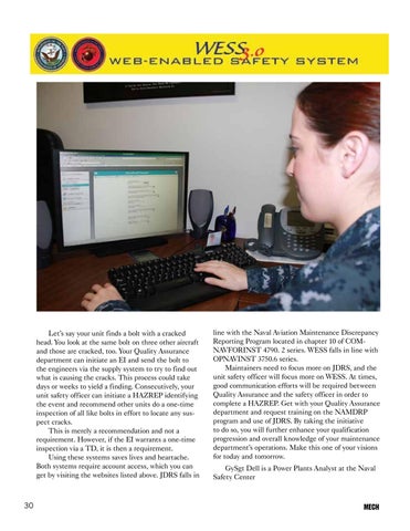 line with the Naval Aviation Maintenance Discrepancy Reporting Program located in chapter 10 of COMNAVFORINST 4790. 2 series. WESS falls in line with OPNAVINST 3750.6 series. Maintainers need to focus more on JDRS, and the unit safety officer will focus more on WESS. At times, good communication efforts will be required between Quality Assurance and the safety officer in order to complete a HAZREP. Get with your Quality Assurance department and request training on the NAMDRP program and use of JDRS. By taking the initiative to do so, you will further enhance your qualification progression and overall knowledge of your maintenance department’s operations. Make this one of your visions for today and tomorrow. GySgt Dell is a Power Plants Analyst at the Naval Safety Center