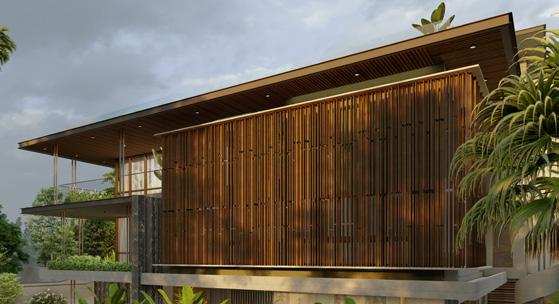 The client, a goldsmith based in Saudi Arabia, requested a tropical and fresh design for his house on a plot divided in two by a retaining wall, surrounded by a hilly terrain, and located in a hot and dry climate. From the initial stage of design, we wanted to create a house that complemented the surrounding terrain and climate, using materials such as locally sourced stone and wood.