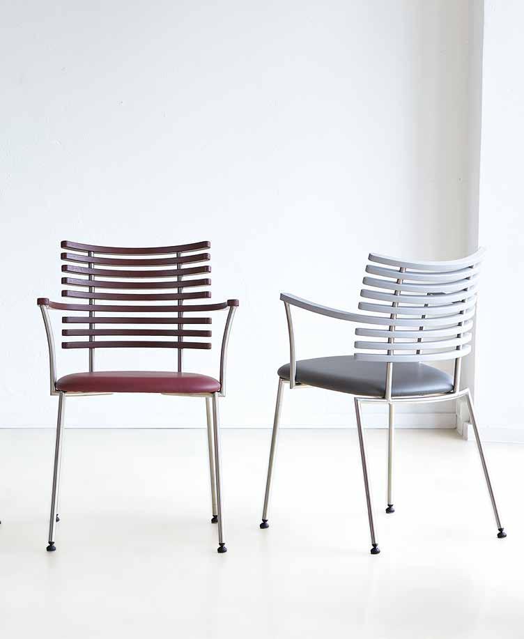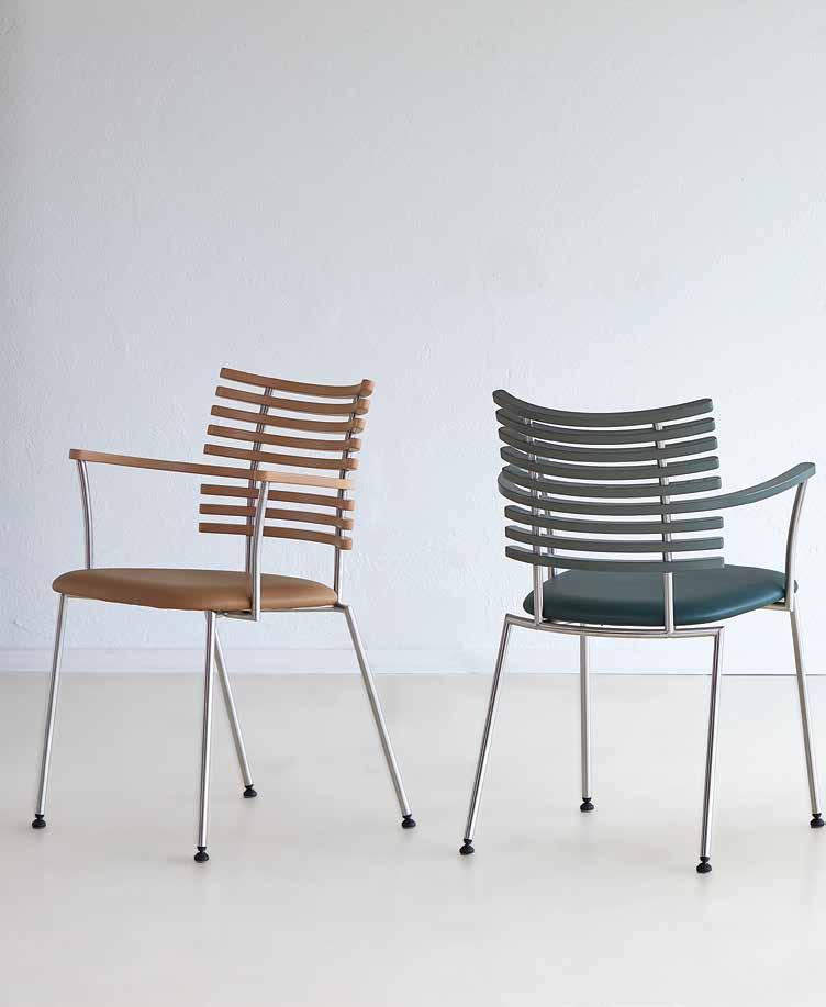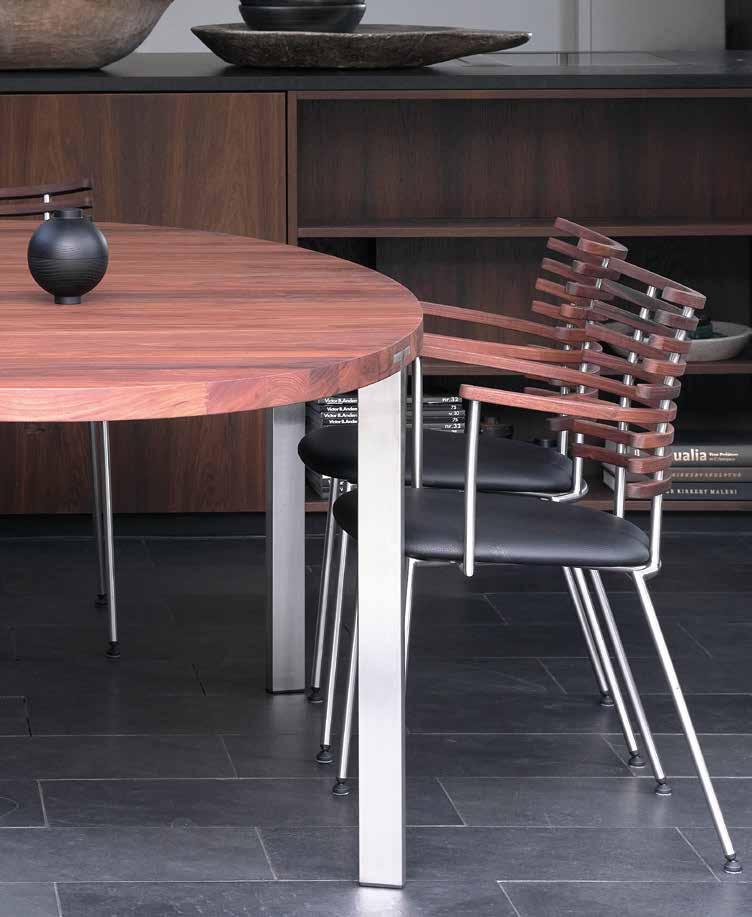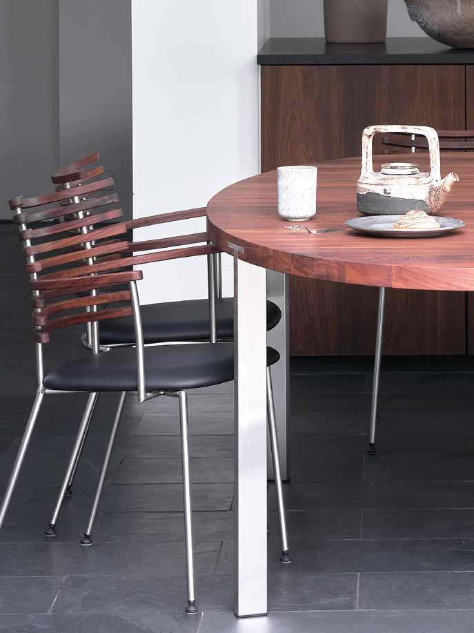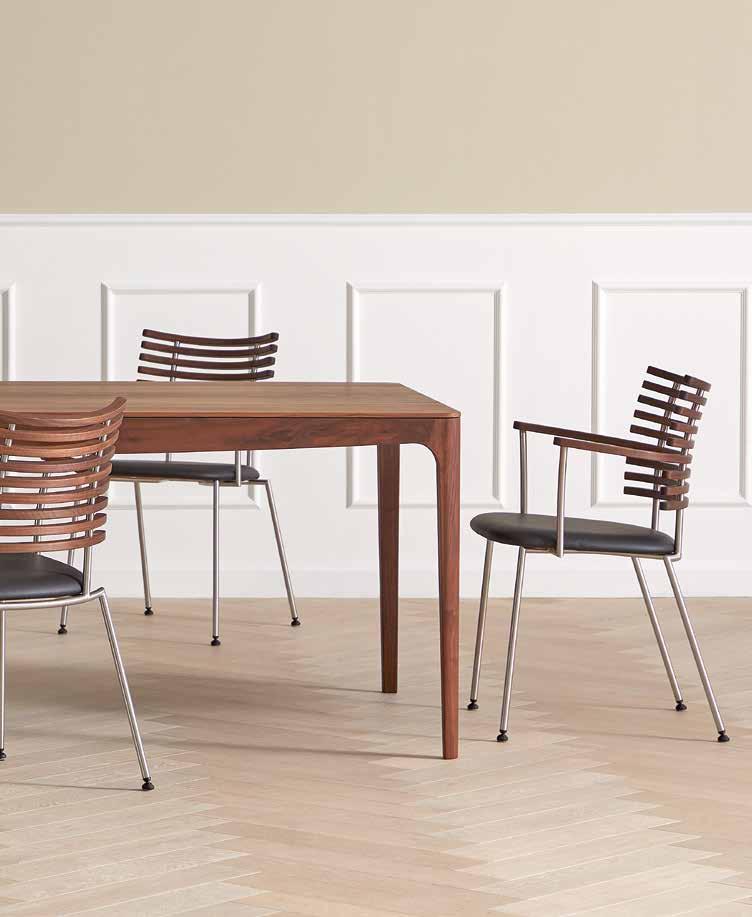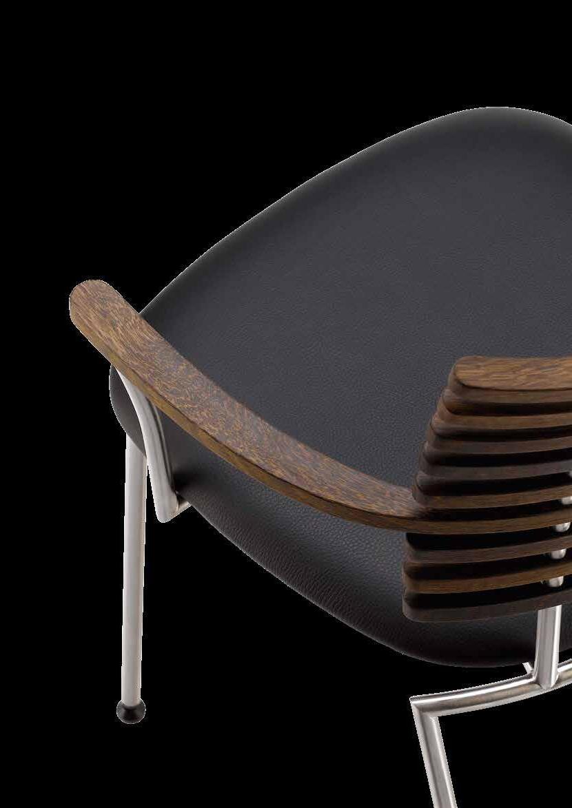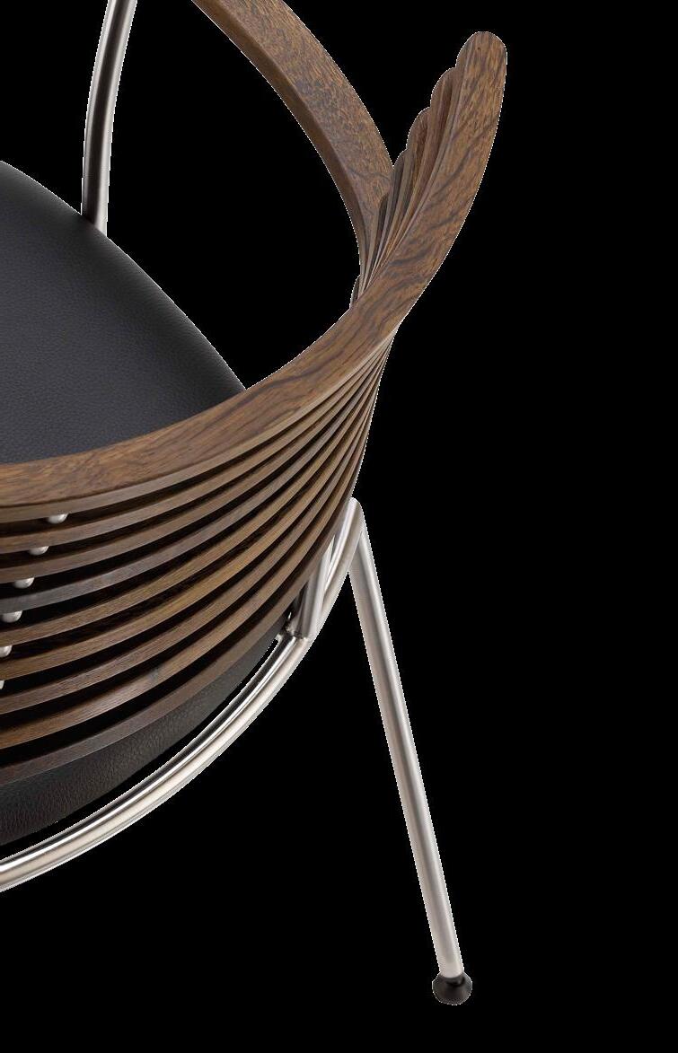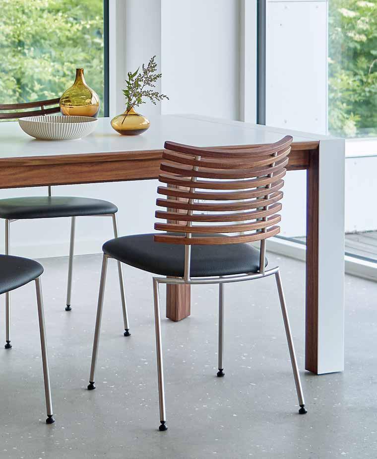 chair combines exceptional aesthetics with high seating comfort, where the steam-bent backrest in solid walnut harmonizes beautifully with the sleek stainless steel frame.