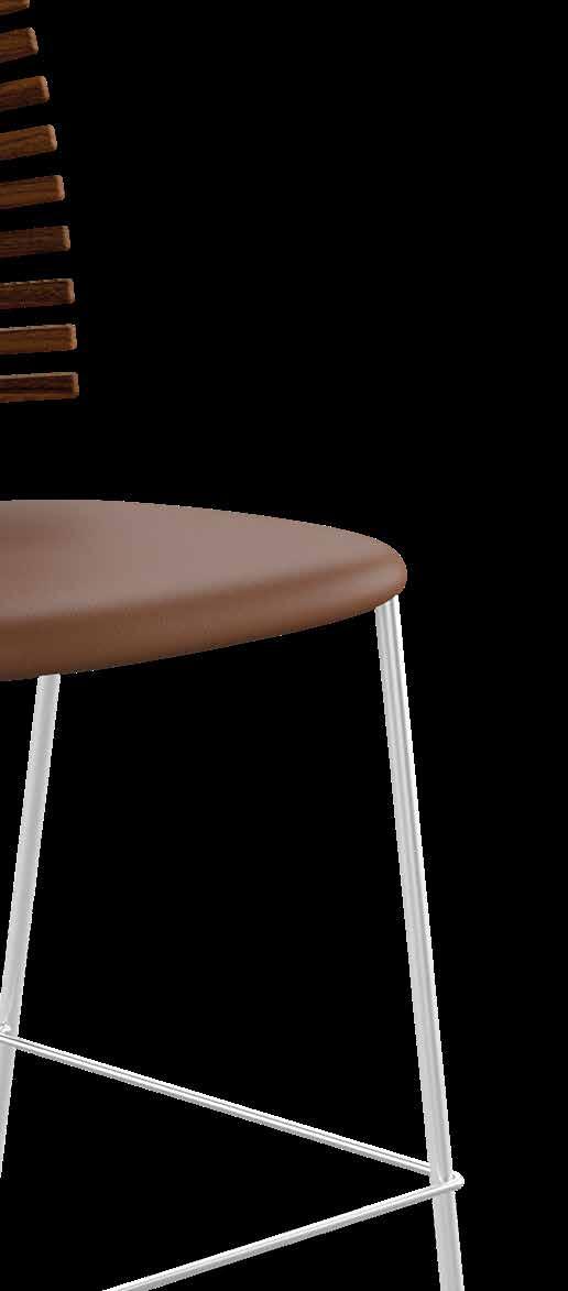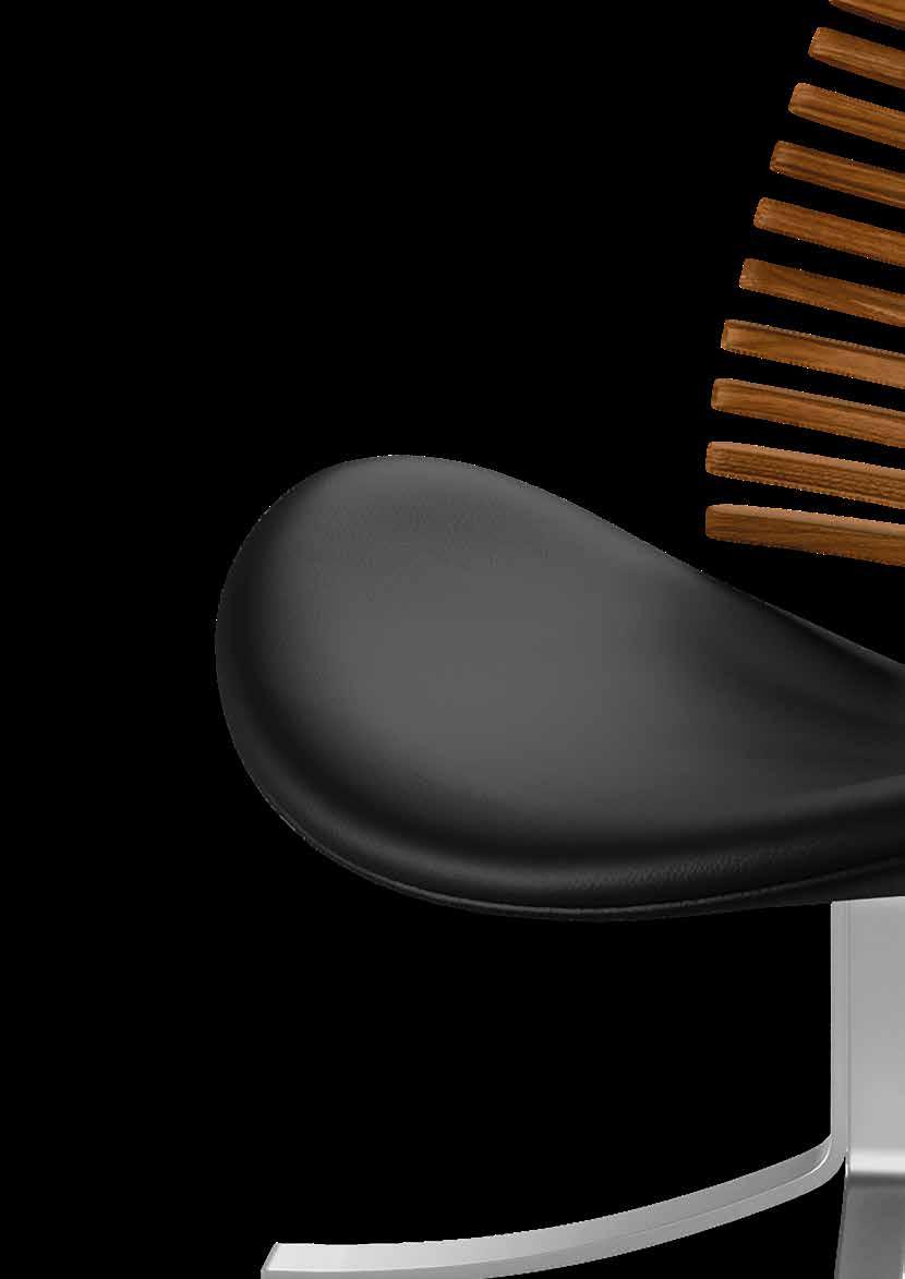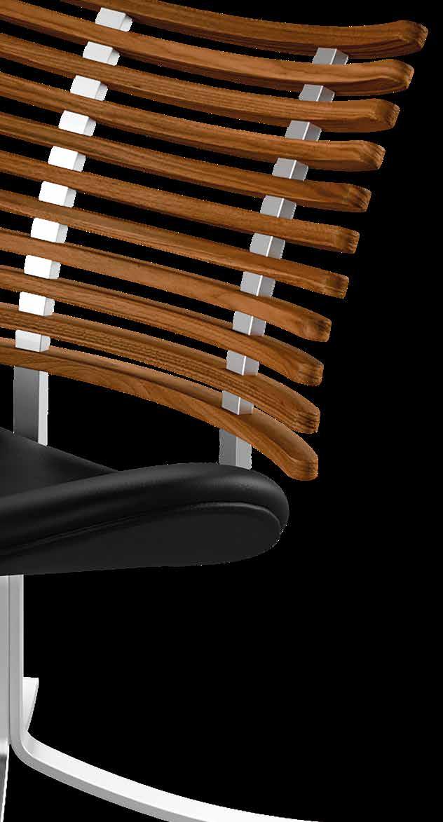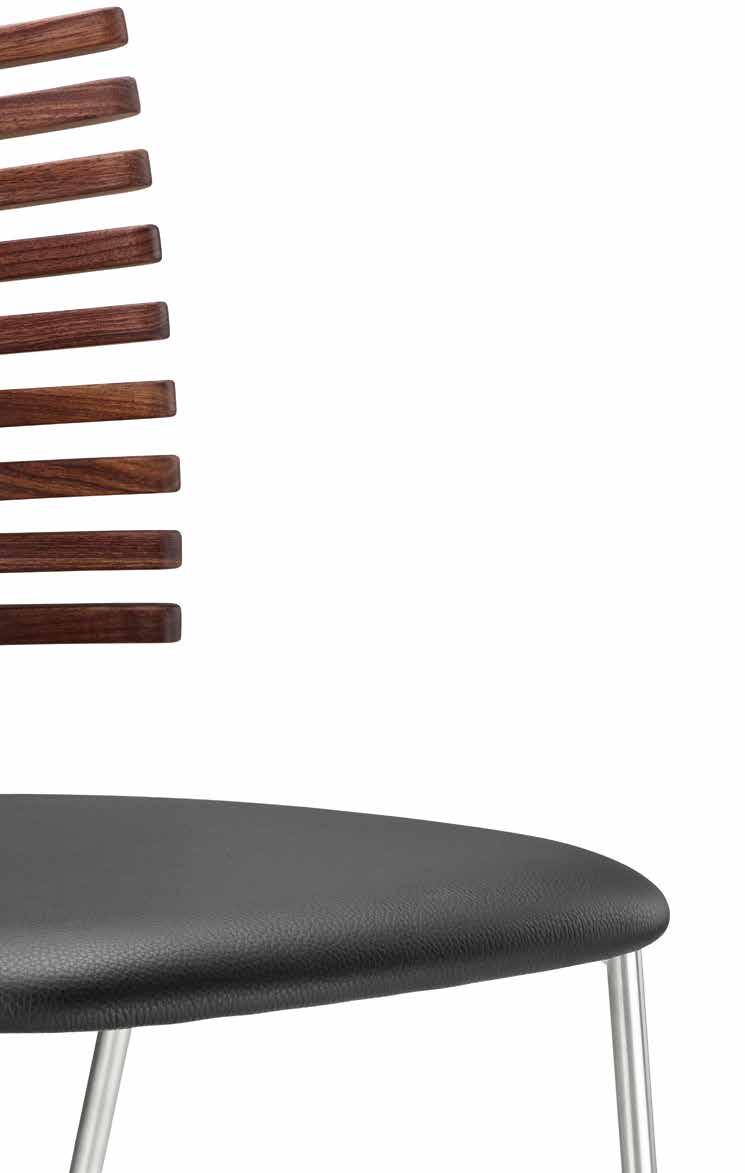 From the many slats produced, nine are carefully selected to match in grain and tone - brought together to form one harmonious backrest. The slats are mounted on a frame of brushed stainless steel or powder-coated steel and completed with an upholstered seat in leather from our exclusive leather collection, in fabric - or in the customer’s own material.