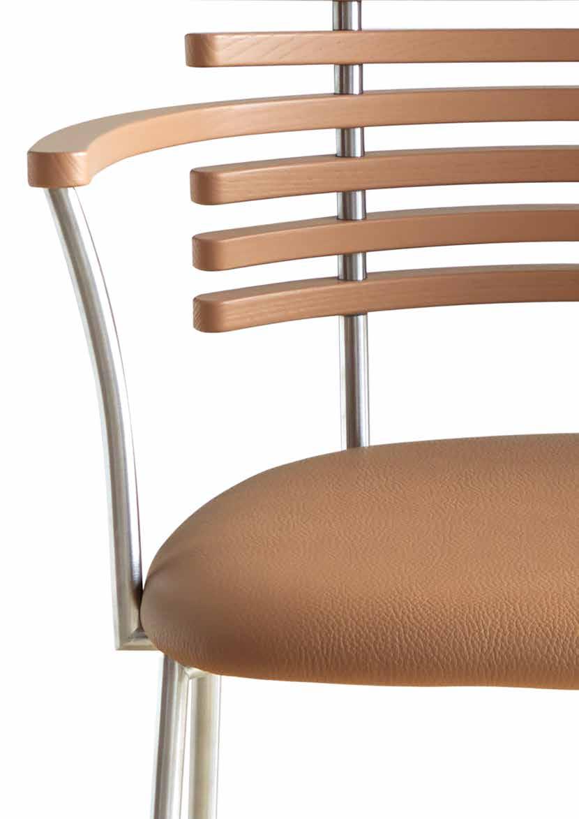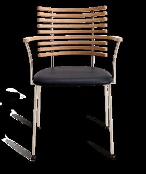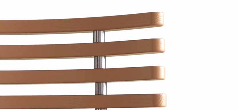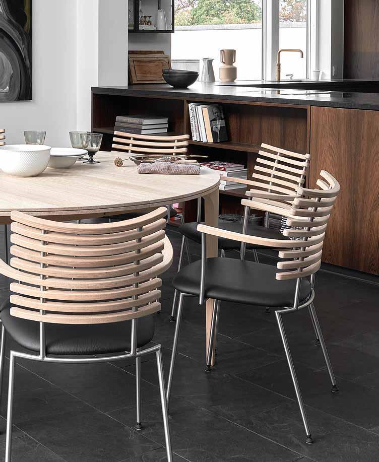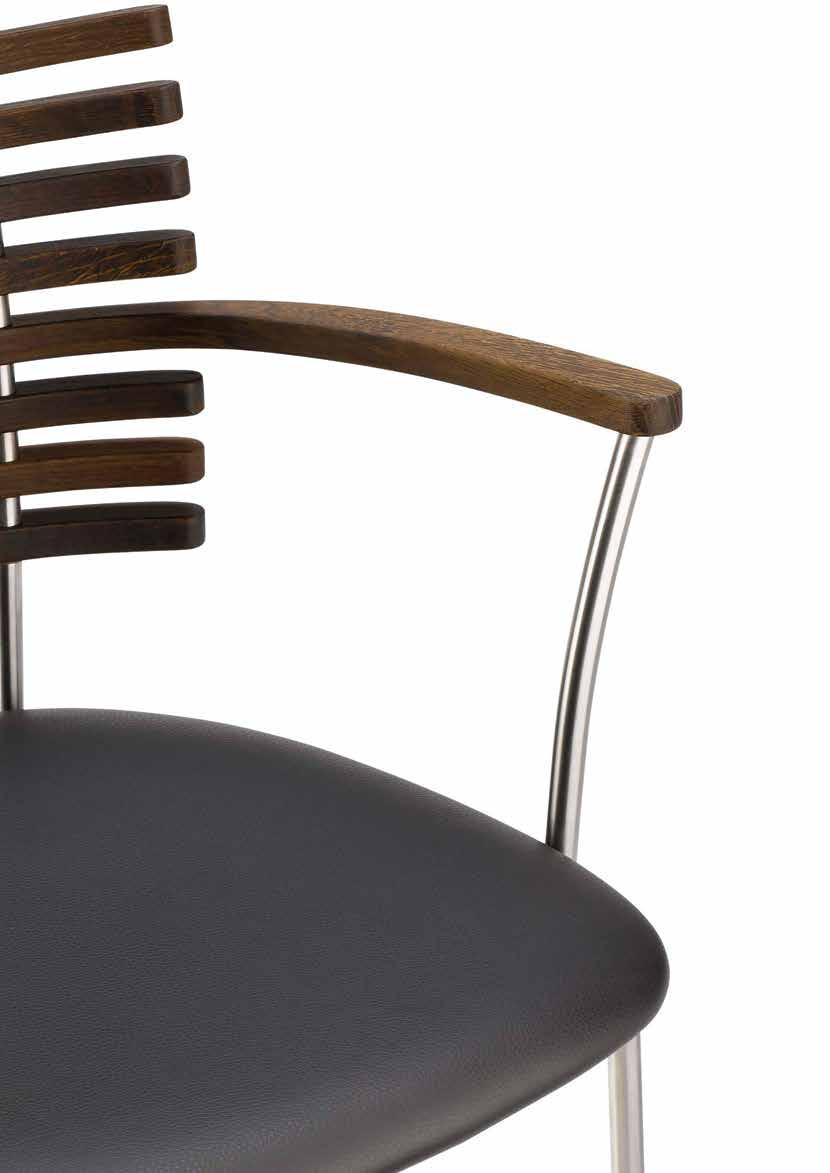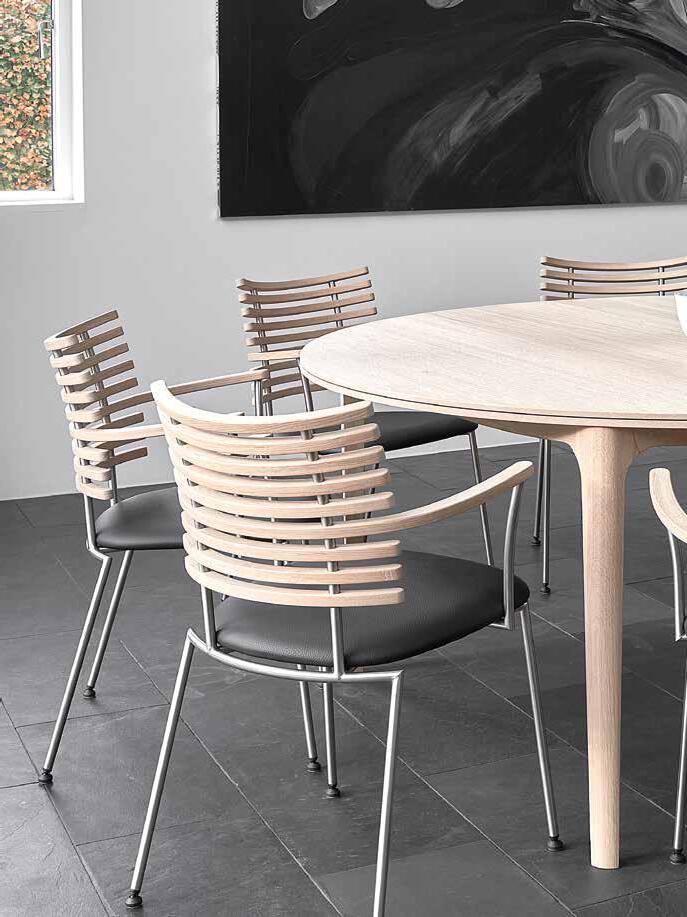 From the many slats produced, nine are carefully selected to match in grain and tone - brought together to form one harmonious backrest. The slats are mounted on a frame of brushed stainless steel or powder-coated steel and completed with an upholstered seat in leather from our exclusive leather collection, in fabric - or in the customer’s own material.