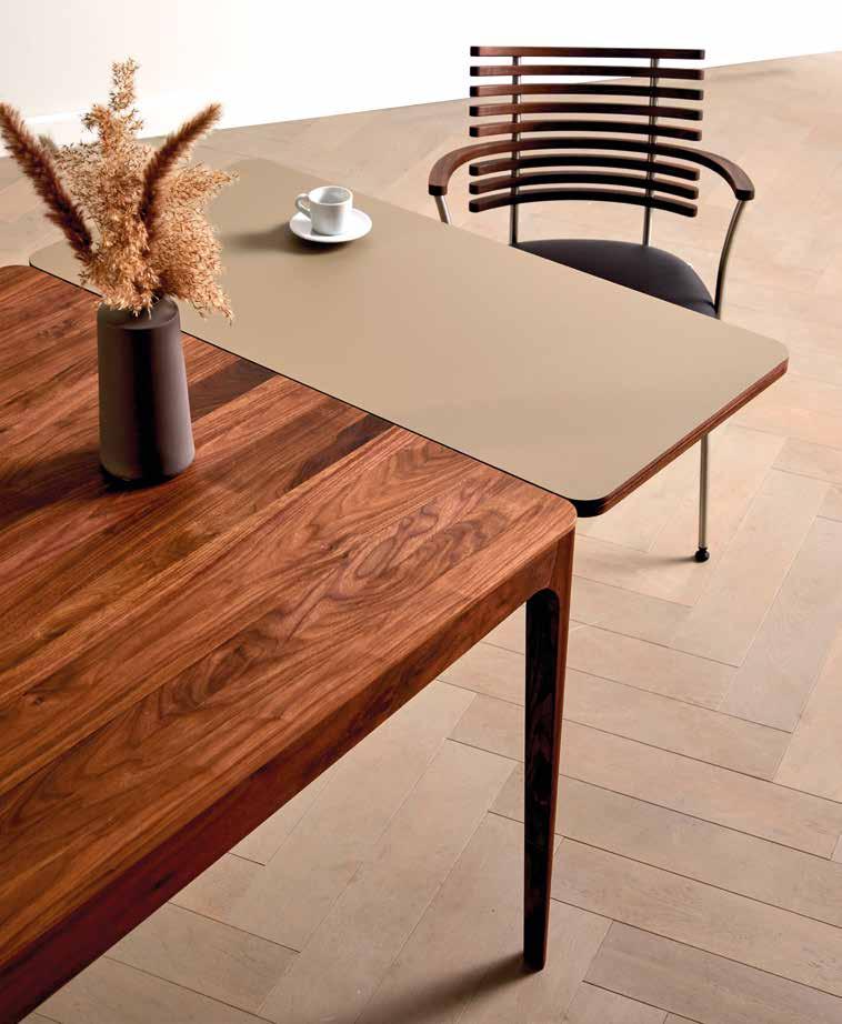 Inspired by classic extension tables, the design has been reinterpreted with a contemporary and refined expression. The solid column has been made partially transparent, creating an elegant play of light. The angled edge of the tabletop is echoed in both the column sections and the base, generating a sense of graphic clarity and calm.