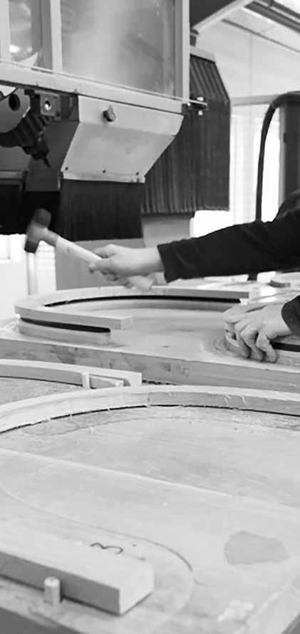 Efter formgivningen tilskæres og slibes hver sprosse, indtil overfladen føles silkeblød. Til sidst behandles træet med enten olie, lak eller malingalt afhængigt af kundens valg - for at fremhæve træets karakter og sikre holdbarhed.