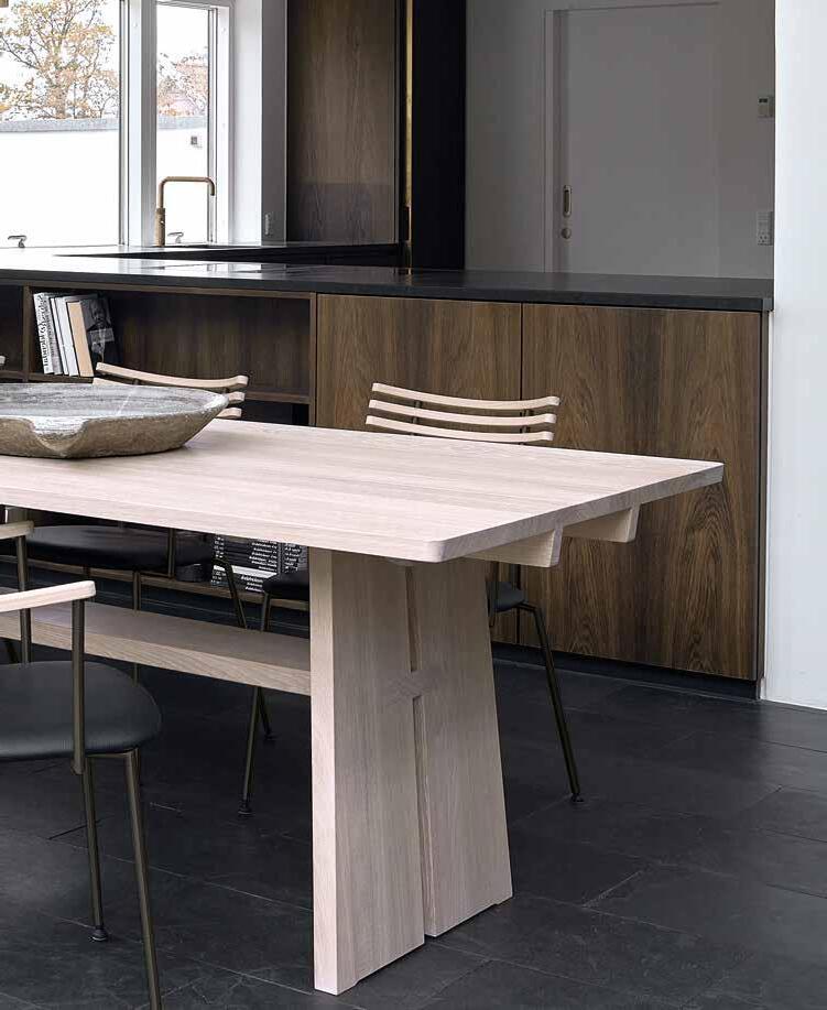 Gehl Dining Table GM 3060, designed by Nissen & Gehl, balances everyday function with guest-friendly versatility. Exposed rails and cross plank add character and highlight fine craftsmanship. Angled lines and soft curves create a harmonious expression.
