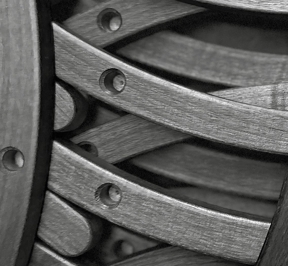 Ud af de mange fremstillede sprosser udvælges ni, der matcher hinanden i struktur og tone - de samles til én harmonisk ryg. Sprosserne monteres på et stel i rustfrit børstet eller pulverlakeret stål og fuldendes med et polstret sæde i læder fra vores eksklusive læderkollektion, i stof - eller i kundens eget materiale.