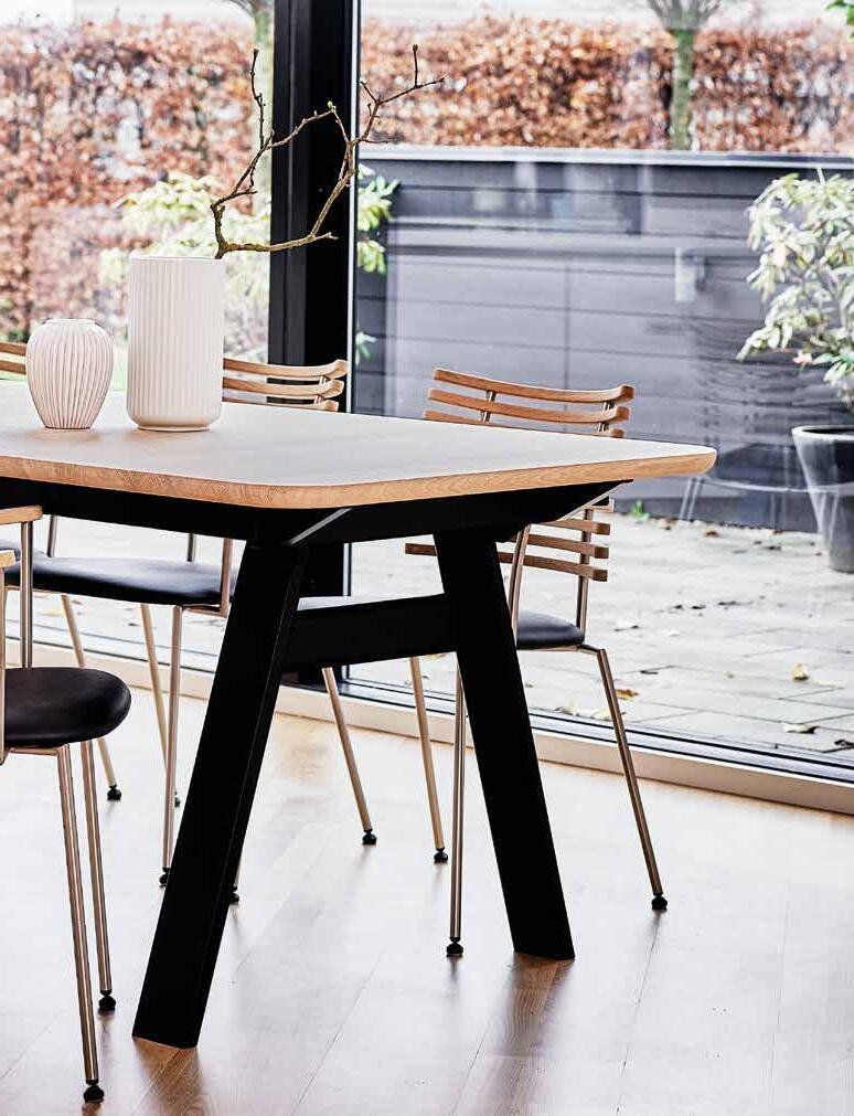 Så enkelt og raffineret - Gehl Spisebord GM 3060 - er et bord både til hverdag og gæster. De to vanger, der støtter bordpladen, samt planken, der samler benbukkene kommer til syne på ydersiden - en smuk og unik snedkerdetalje. Designet leger med vinklerne for at skabe karakter, og samspil mellem træet og det rene, ærlige formsprog er på samme tid både dynamisk og harmonisk. Bordpladens rundinger er kombineret med en faset kant, der tilfører en blødhed til det ellers stringente look. Her vist i symbiose med Tiger Armstol GM 4106.