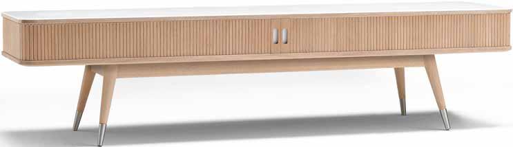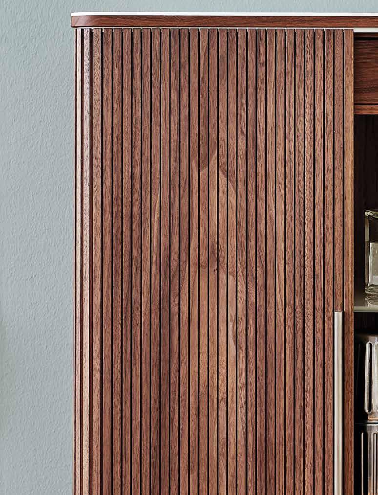 The slats of the sliding doors create a beautiful visual effect. Behind the sliding doors, the sideboard is divided into two compartments with glass shelves and four drawers.