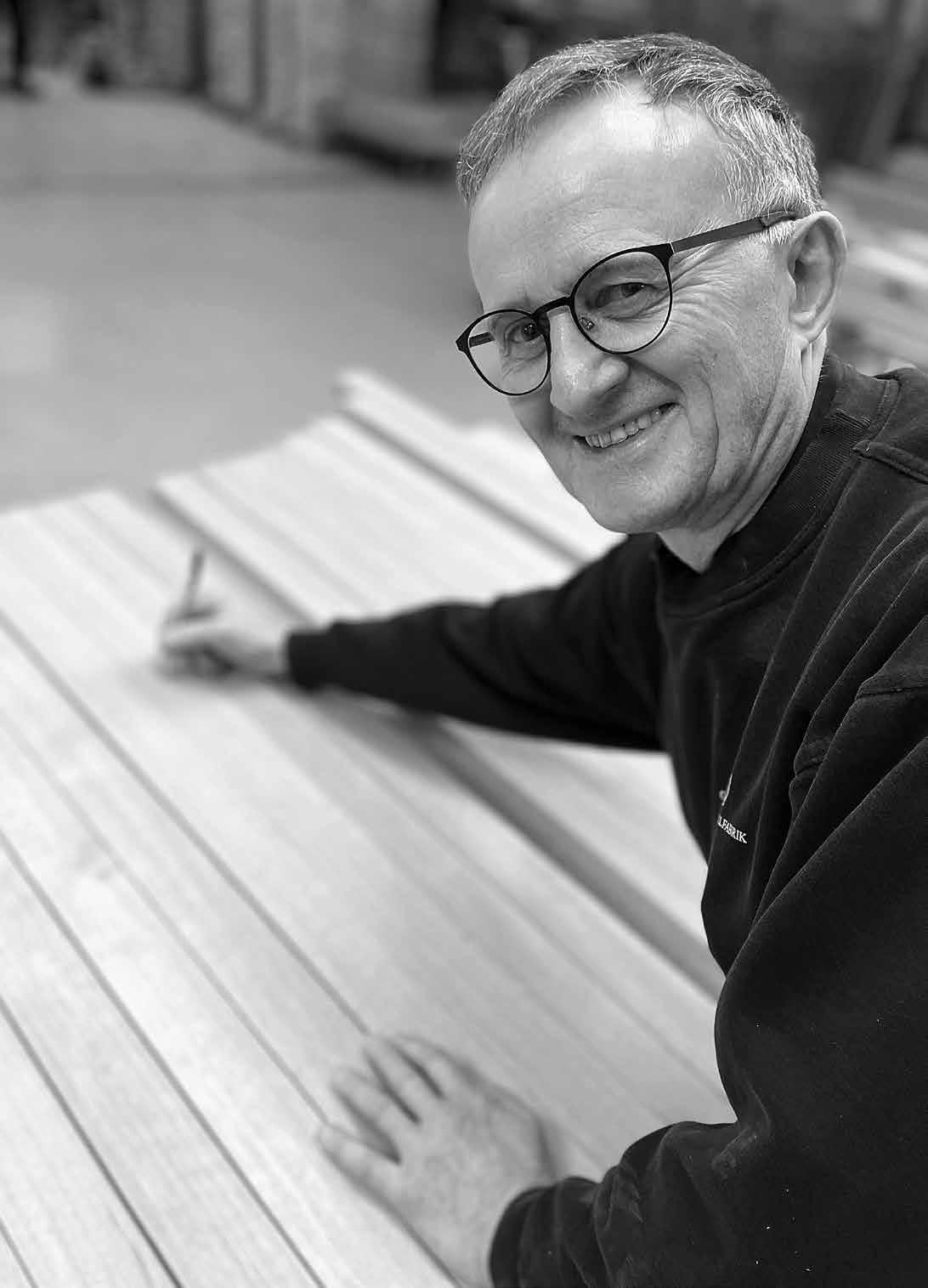 Hans Erik Schou, 65 Years. Employed for 11 years, Hans Erik is a cabinetmaker who works with sorting and selecting wooden slats for tabletops in walnut, oak, elm and ash. He has been working with wood since he started as an apprentice at the age of 19. In his spare time, he is active in running and swimming.