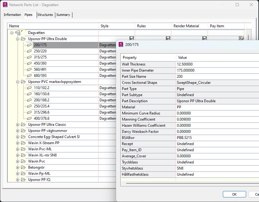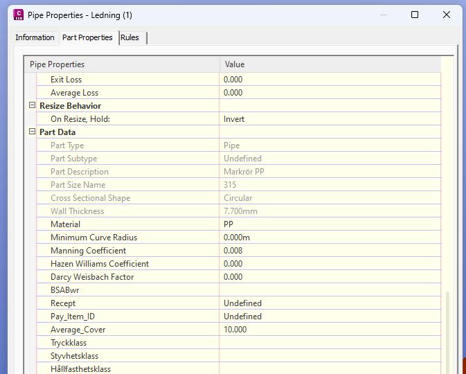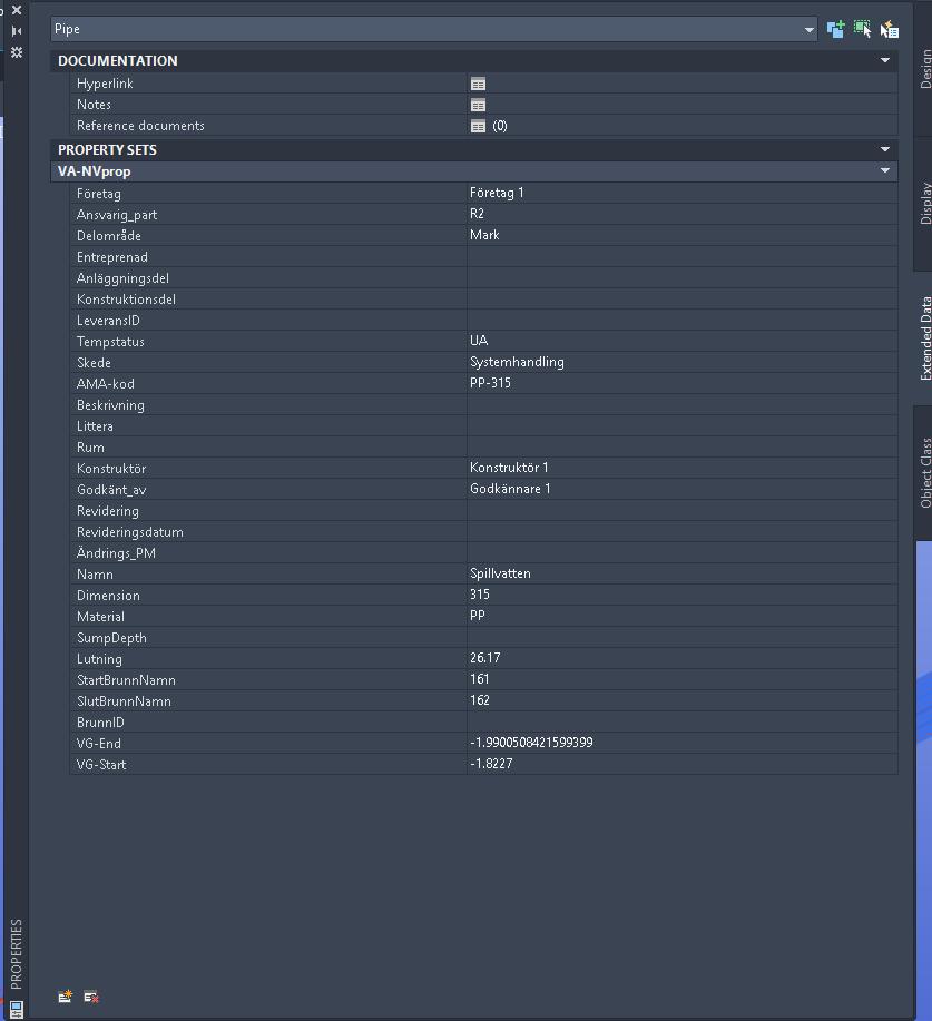 Exempel: Lutning, vattengångshöjder, anslutning mot brunnar, unikt namn på ledningen, namn på systemet det tillhör, CAD-lager