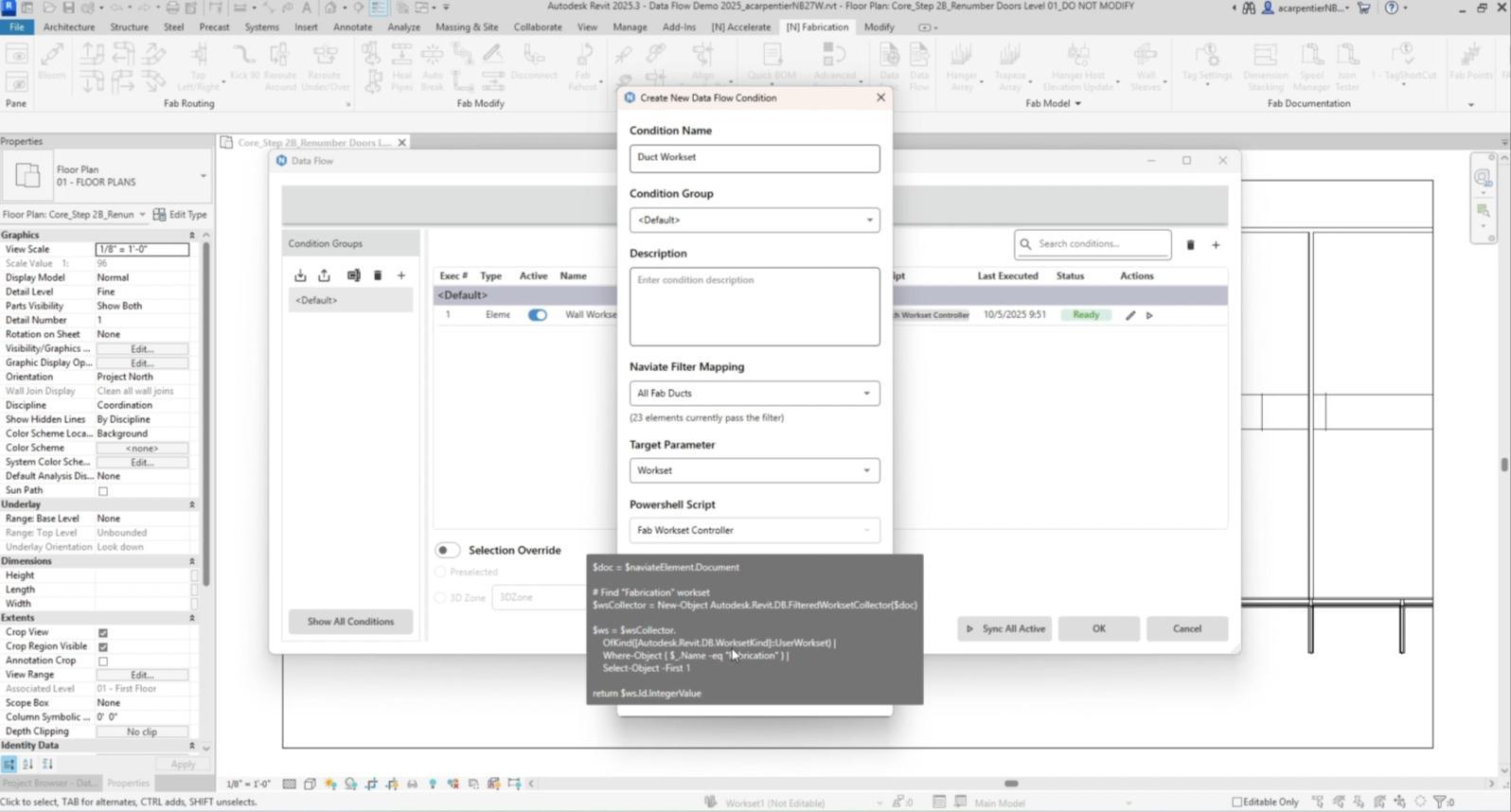 The Naviate Fabrication Data Flow easily automates Revit Element data synchronization with custom PowerShell scripts driven by user-defined conditions. The team is implementing AI to assist users in generating and updating scripts using regular semantics.