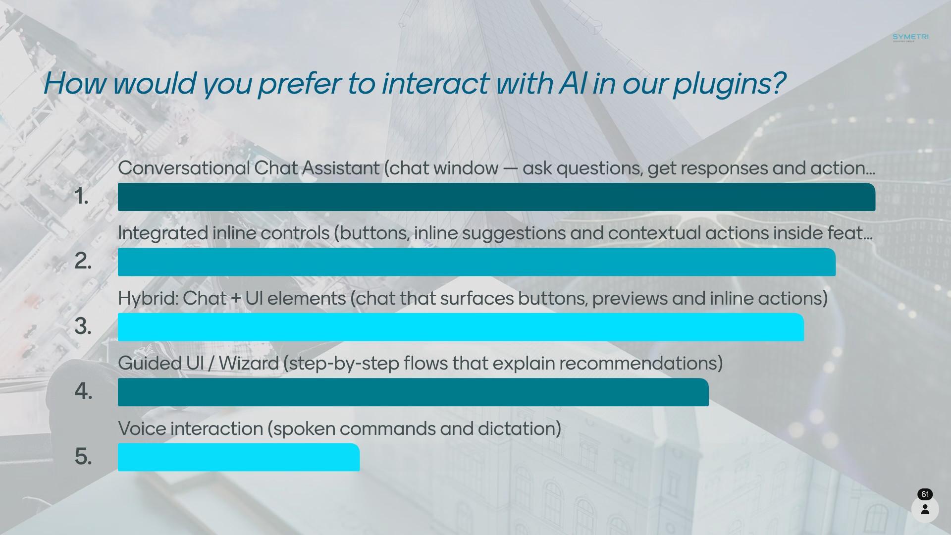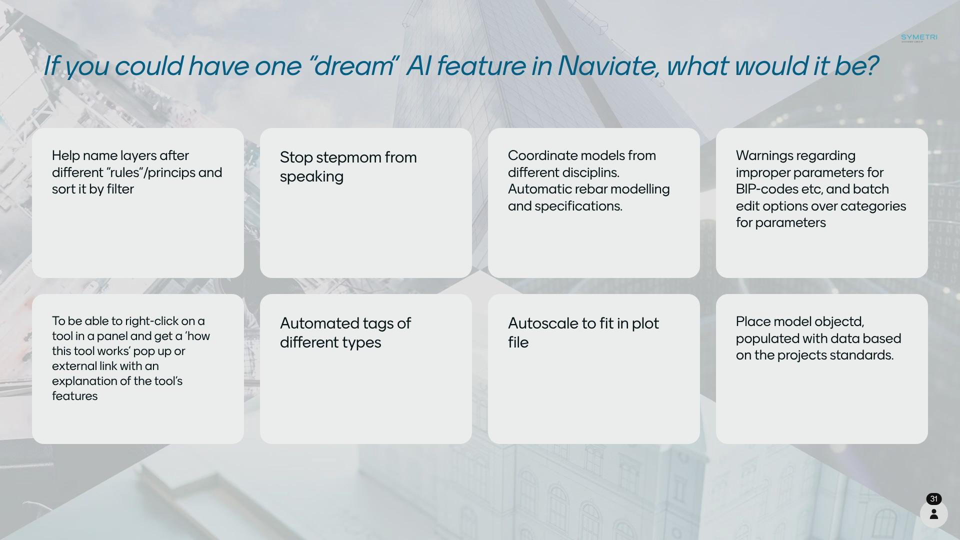 • BIM Copilots: Code-compliant modeling, automated tasks, quantity takeoff, and 'ask your model' chat.