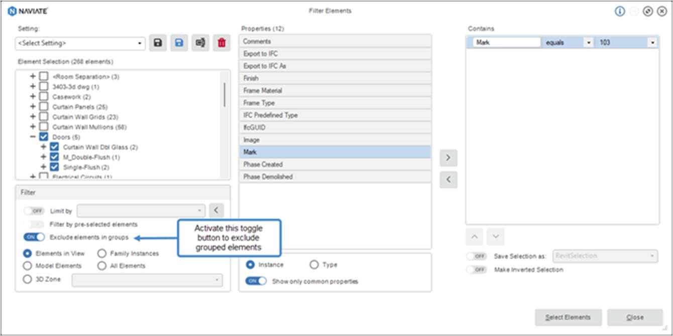 NowwhenusingFilterElements featuretoselectelementsorsave selections,youwillbeabletoexclude elementsthatareingroups.Thisis simplydonebyactivatingatoggle button.