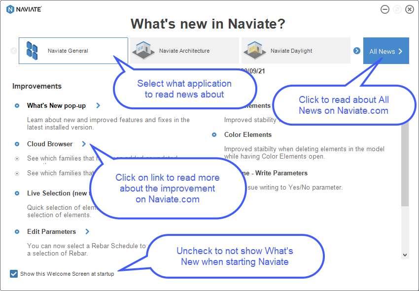 What’sNewdialogboxisturnedoffby default.TheWhat’sNewdialogbox willnotshowupwhenRevit/Naviateis startedunlessyoumanuallyhave turnediton.