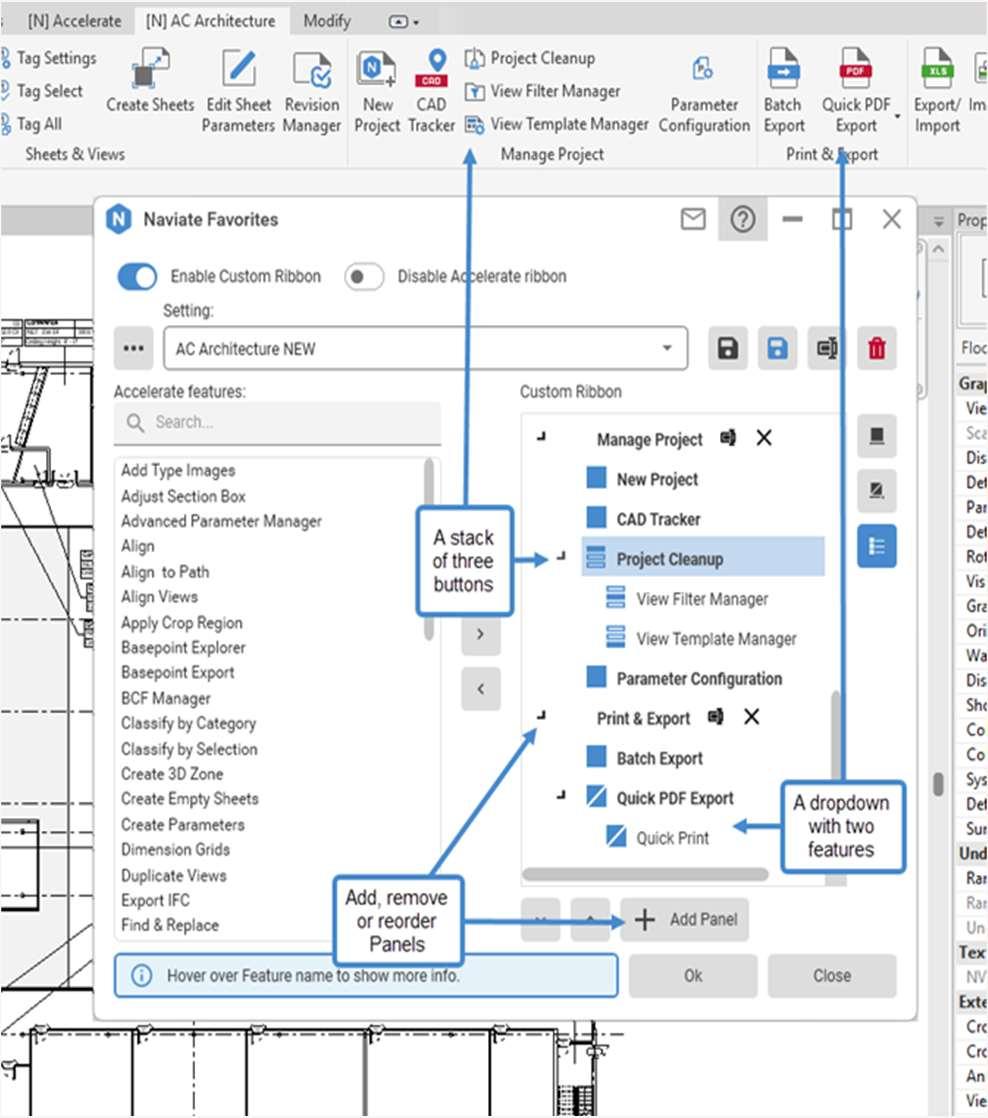 Anewfeaturethatletsyoucreateyourown customNaviateAccelerateribbon containinguser-selectedfeatures.Naviate Acceleratecomeswithpre-installedpresets for: