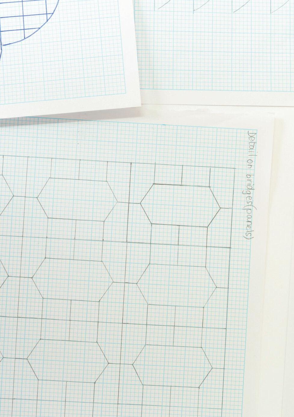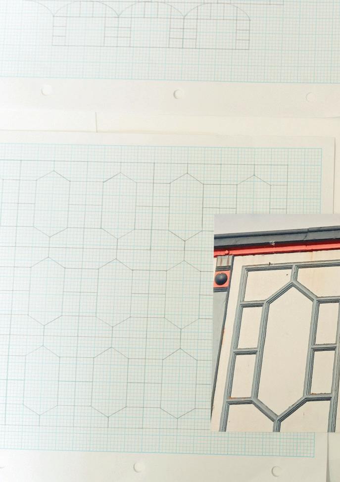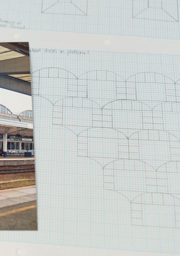 After spending periods of time observing the architecture at the railway station and viewing images from local archives, Emma photographed and documented various features of interest. She then interpreted these details into geometric line drawings and created a series of repeated patterns.