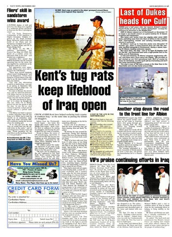 mates were champing at the bit for something different. "It was a bit of an adventure find the most seaworthy tugs, get them running, then sail them, " he added. "By driving the tugs around the waterways, towing and shunting barges, they were freeing up berths and jetties so merchant trade could get going. "Most of us have only seen Iraq from 12 miles away, so one thing the guys who went to Basra found was that it was great meeting the locals face-to-face. It was a very positive experience. " The 'tug rats' - OMs Robert Grant, Leon Ashton-Leatherland, Lt Chris Flaherty, PO Martin Jervis, MEM Karl Ellis, LMEM Robert Leaver, and LOM Hadyn Andrews - spent a week chugging up and down the Shatt-al-Arab river, searching barges, shunting some and impounding vessels trying to sneak oil out of Iraq. They had to deal with an engine room flooding daily, a small fire, a man overboard, and a runaway barge, plus the less than pleasant surroundings of a disused fertiliser factory as their base each night. "We're all extremely proud of what they achieved in the short time they were away, " Kent's captain Cdr Simon Hardern said. "They showed the flexibility of young people in the armed forces. They have been able to contribute, in a small way, towards the regeneration of Iraq. " • Crew of HMS Norfolk bagged smugglers after just three days on patrol in the northern Gulf. A boarding party found 300 tonnes of oil thought to have been sneaked out of Iraq, hidden on the UAE-flagged Mv Noora 1. The ship could be responsible for smuggling up to 5, 000 tonnes of oil out of Iraq on previous visits. Noora 1 has now been detained and her crew arc awaiting trial by the Iraqi judicial system. Norfolk's captain, Cdr Tony Radakin, said: "This is an exceptional start for us and an encouraging result in the fight to prevent the smuggling of oil. We're determined to ensure that oil exported from Iraq is done legally. "