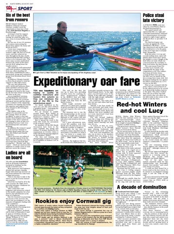 The surf on the first day was up to three feet, providing excellent waves for coaching the more inexperienced paddlers in the RNKA’s four new highperformance surf kayaks, recently bought with help from the RN Sports Lottery. Skills taught included surf safety, how to catch waves, turning at speed, reacting to the conditions and surf etiquette (the rules of the ‘road’). The intention was to run the RN championships on the second day, but overnight the conditions flattened so the contest will now take place next month at the InterServices. On a more adventurous note, several RN paddlers took their kayaks into the Irish Sea for a trip along the coastline of Anglesey. Apparently the last time we featured a major expedition by the association to Ecuador in 2004 it was “cut down to a crappy little column not worth wiping your arse with...” (Mea Culpa – Assistant Ed.) Anyway... the Anglesey trip was, in the words of Lt Mark Jameson (a