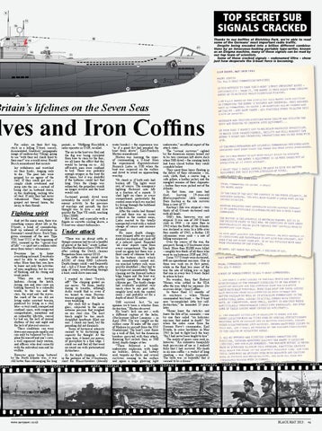 TOP SECRET SUB SIGNALS CRACKED Thanks to our boffins at Bletchley Park, we’re able to read some of the Germans’ most important radio traffic. Despite being encoded into a billion different combinations by an innocuous-looking portable type-writer, known as an Enigma machine, many of these signals can be read by our top team of scientists. Some of these cracked signals – codenamed Ultra – show just how desperate the U-boat force is becoming.