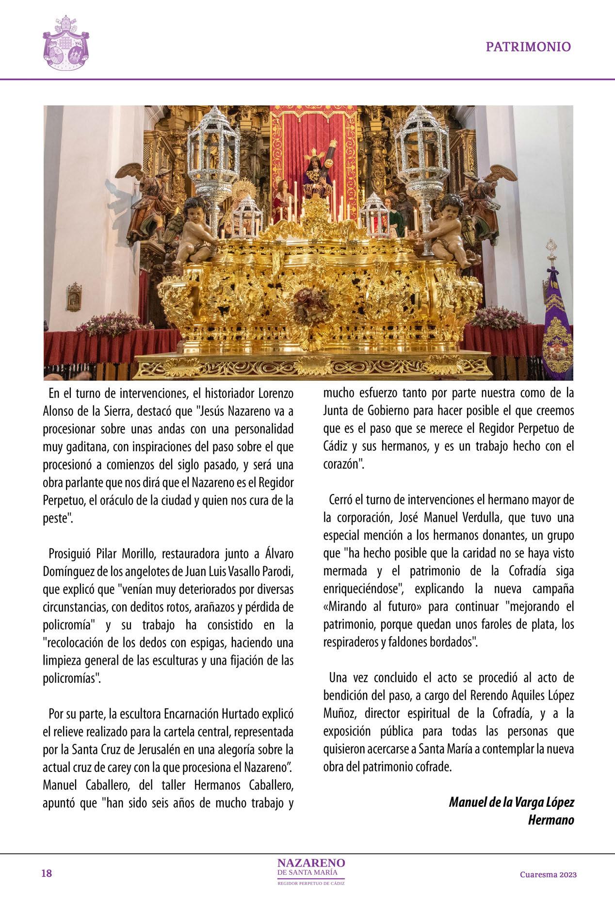 rLa Cofradía del Nazareno de Santa María y todos/as sus hermanos/as y devotos/as guardarán con emoción y recuerdo la fecha del miércoles 30 de marzo de 2022 como el día en el que tuvo lugar la presentación oficial del nuevo paso de Nuestro Padre Jesús Nazareno que ya procesionó el Jueves Santo de 2022 y en la Magna de septiembre, una joya de la Semana Santa andaluza al más puro estilo de Cádiz para el Regidor Perpetuo de la ciudad.