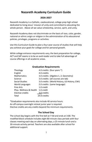 Nazareth Academy is a Catholic, coed, college prep high school dedicated to living Jesus' mission of unity and committed to educating the whole person. Above all we value: SCHOLARSHIP: We are committed to academic excellence by providing a challenging, innovative curriculum and an appreciation of the arts. We make our learning environment the place for great potential for all. SERVICE: We make a positive difference in people's lives and develop a sense of responsibility and leadership. We guide our faculty and students toward an appreciation and sense of mission by ministering to others. SPIRIT: We value creative participation in the life of the school, thereby encouraging all to develop their unique abilities. UNITY: We realize the value of self and others. We integrate learning with Christian values and faith and work to unite with God and one another.