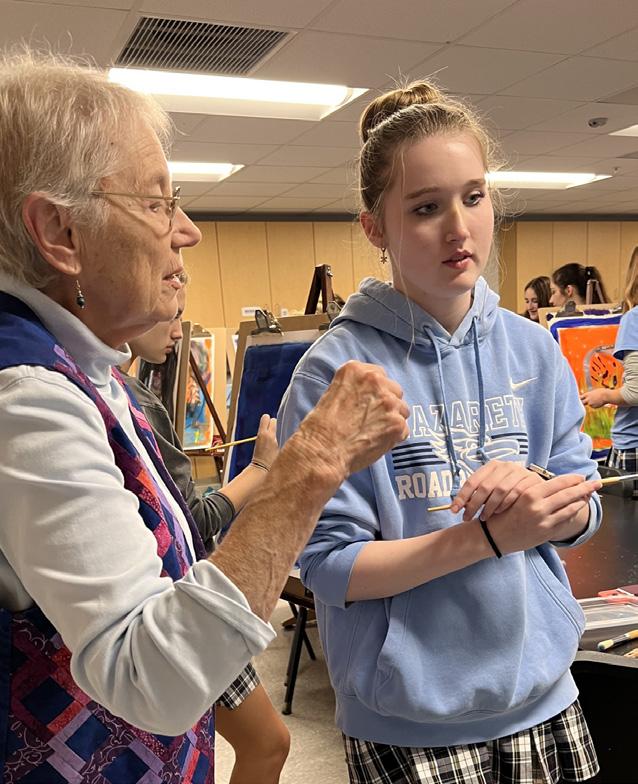 Traditionally around St. Joseph’s Day, Sisters visit as guest lecturers, speaking to students about how academic subjects like Theology, Science, Social Studies and Art intertwine with and can express the mission. Those interactions can take place at any time. This fall, world renowned artist and sculptor, Sister Mary Southard ’54, whose beautiful work can be seen throughout campus, led the Art Club in a live painting demonstration called “Paint From Within.” “Because we are created in the image of God, I convey to students that each of us is creative in some way,” said Sister Mary. “At their age, they are actively dreaming about and creating their lives and futures. Painting is one way to allow what is moving within to flow outward so that it can be seen and realized.”