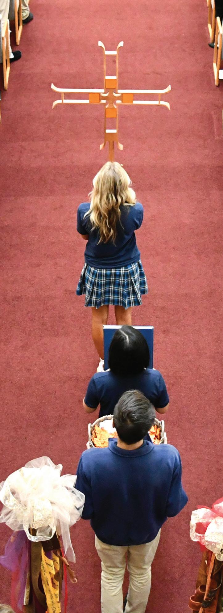 Sisters and students regularly gather in Alexine Chapel for prayer services, Masses, graduations, concerts and other events. At last year’s graduation, Sisters Pat Bergen and Mary Jo Curtsinger handed each graduate a key tag emblazoned with the words, “Saint Joseph, Pray For Us,” to serve as a reminder to keep the Congregation’s mission and the values of their Catholic education with them always. Sisters Pat and Mary Jo also recently visited theology classes as guest lecturers and spoke to students about how the CSJ mission can be lived out in today’s world. Musician and composer Sister Kathy Sherman has been present all year to inspire and celebrate with students at Masses and prayer services. “We Sisters consider it a joy to participate in mentoring students for leadership to carry out the mission of Unifying Love in the Church and our world,” said Sister Pat.