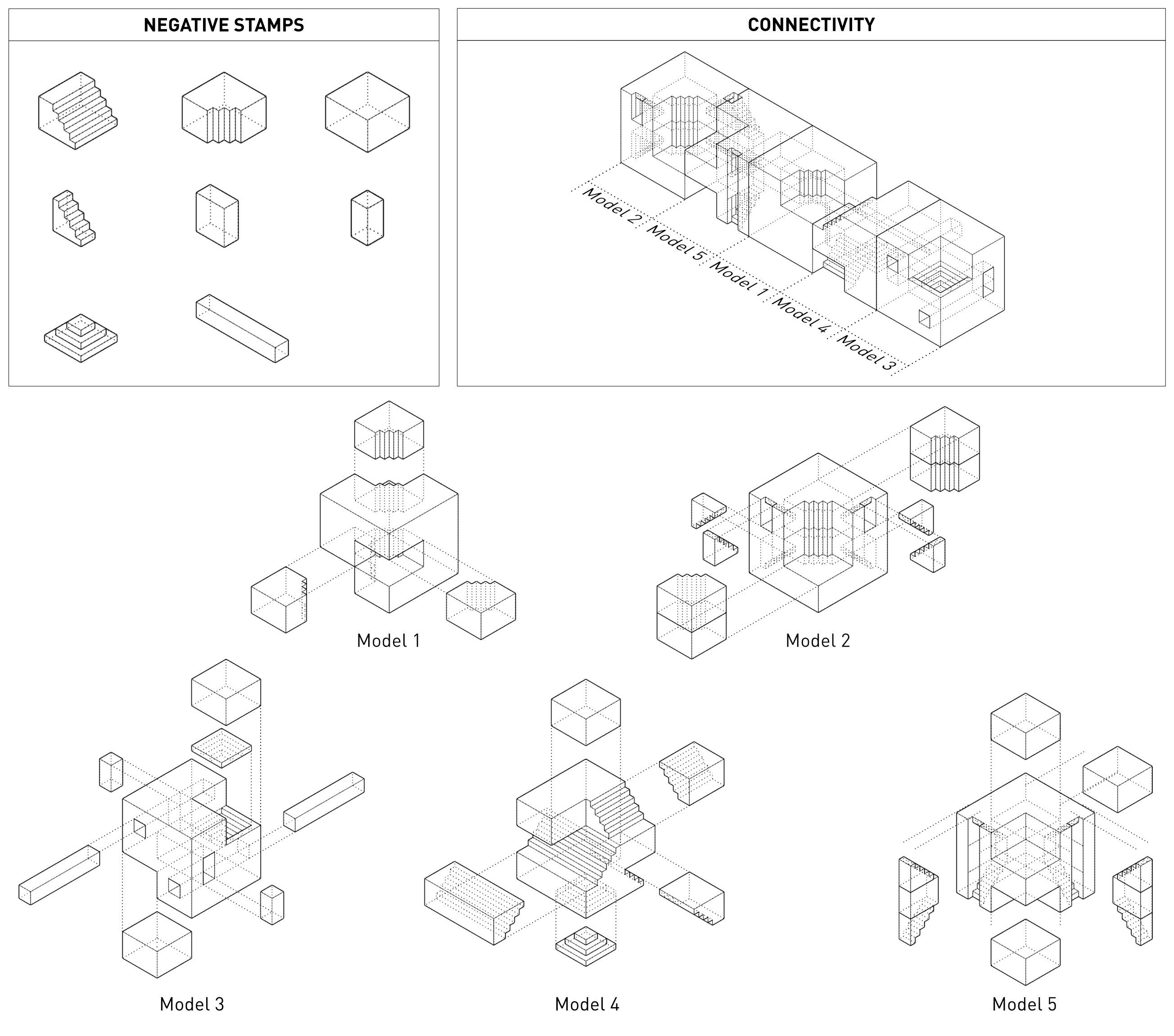 The project reframes building residues from a nearby production hallmetal,woodandglassoffcuts-notaswastebutasamateriallibrary.Witha circulareconomyapproach,ittreatseachfragmentasaresourcewithvalue, testing repurposing and recombining pieces that would otherwise leave the cycle. Design development focuses on modularity. a set of negative stamps defines interfaces so pieces join into larger compositions and build new geometry. From this fixed vocabulary, five modules emerge that operate independentlyorasasingleassembledstructure-anadaptiveorganismthat growsthroughreuse,repairandreconfiguration.
