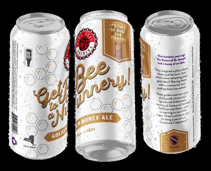 Nazareth’s special-edition centennial beer, a collaboration with Nine Spot Brewing Owner Chris Nothnagle ‘99, debuted in May 2024 at senior celebration events and at a special lunch for faculty and staff who are also alumni. Get Bee to a Nunnery was named with a fun nod to Nazareth’s founders, the Sisters of St. Joseph. The beer will be served at additional campus events during Naz Weekend 2024, and is also available around town.