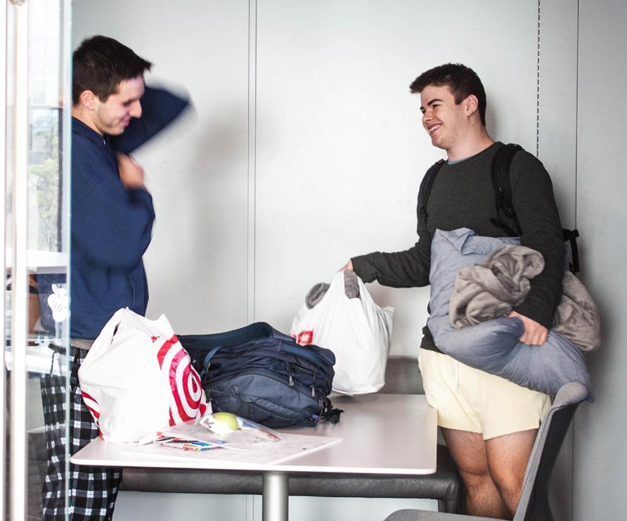 Ben Now I know all of you have slept on a twin XL school mattress. Good news: the couches in Group Study room 2146 might be a slight step up. Placing two couches perpendicular to each other, Gabe and I are close enough for emotional support but far enough apart to maintain our independence. I’m warm, safe and have about an inch to my left until I fall onto the floor. Can’t wait to get some shuteye and see what Mudd has in store for us come morning.