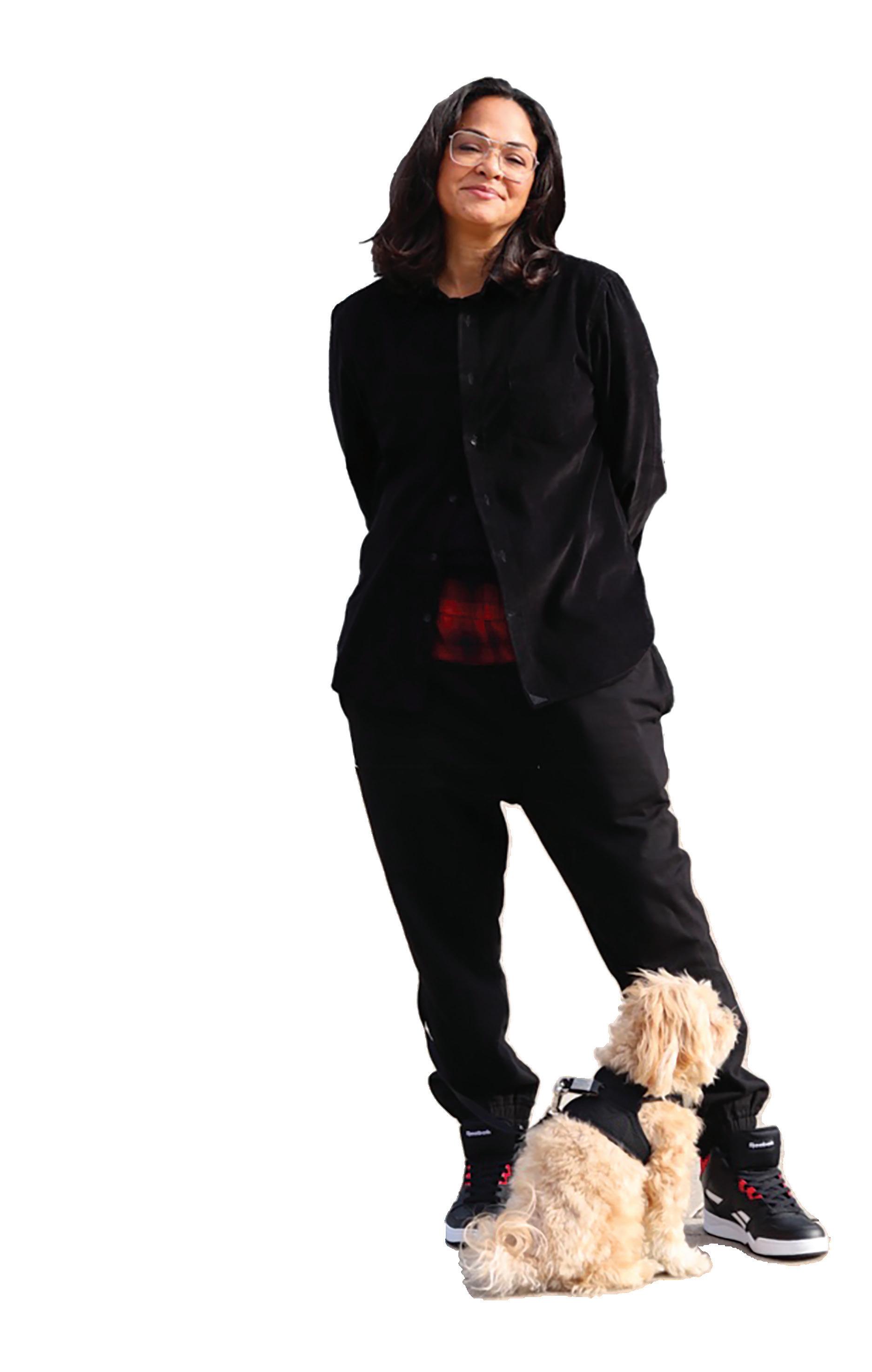 KO with their dog, Eddie, who accompanies them to campus every day.