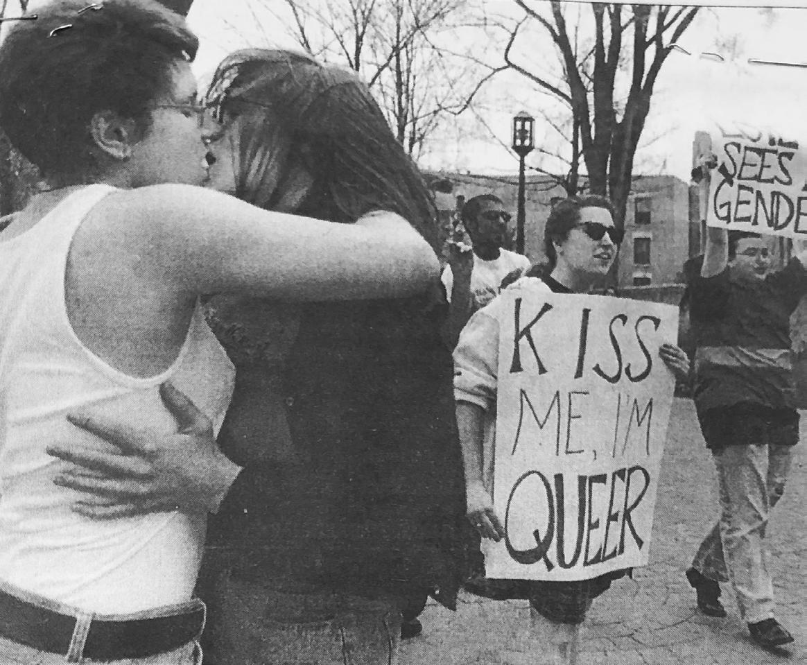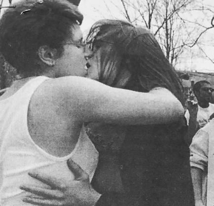 In April 1997, about 20 students made a point of PDA in front of the Rock. After a speech by the director of the Illinois Federation on Human Rights (today known as Equality Illinois), students got to smooching. The students had a competition for best kisser and awarded “butchest” walk and “queeniest” walk titles. While the Daily Northwestern quoted a CAS (no W yet!) sophomore who “didn’t mind gays and lesbians” but wondered why “they have to make a circus out of it,” others were more accepting, like another sophomore who said he wasn’t “used to seeing same-sex kissing,” but found it “cool.” Co-organizer and Bisexual, Gay and Lesbian Alliance member Shana Krochmal (Medill ’99) “didn’t want to sit around saying ‘Oh, we’re gay and oppressed.” Instead, the organizers of the event wanted a “celebration” – and to shock the “campus’ conservatism.” Oh, how the tables turn!