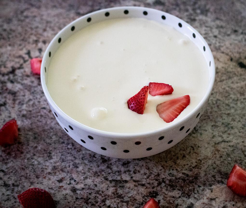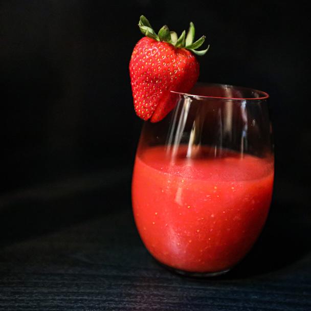 Blend until smooth and divide among 6 tall glasses. Garnish each glass with a strawberry slice.