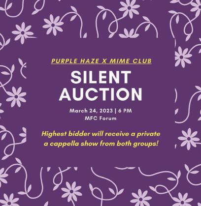 Purple Haze A Cappella and the Mime Club will be hosting a silent auction next week, and the highest bidder will receive a private a cappella show! They’ve been keeping it quiet, but the Mime Club has been practicing for months. This show is sure to knock your black-and-white striped socks o . (Disclaimer: No singing will be involved. Awkward dancing and smiling only.)