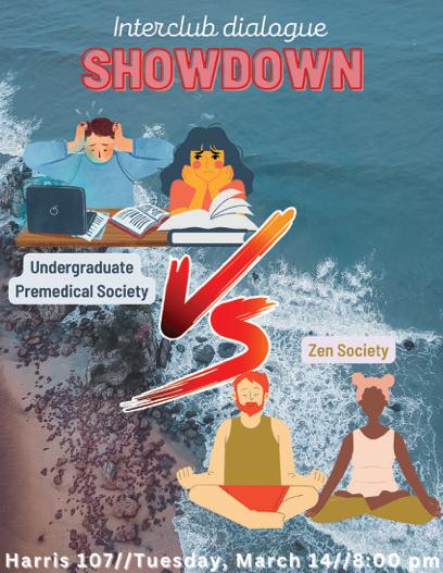 It’s the spectacle of the quarter! We’ve gathered the most high-strung and most laid-back students we could nd and put them in one room. Buy your tickets now to see the Undergraduate Premedical Society and the Zen Society participate in an interclub dialogue. We’re not sure who will crack rst! If a member of either side converts to the other, the entire audience will receive a free Xanax prescription and one-hour back massage.