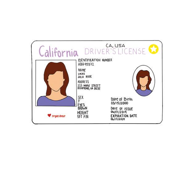 When you nally see the vivid color of my real ID, you might have to shield your eyes. Your arm might sag with the weight and strength of the plastic and a single tear might wet your cheek when you realize I am not that carefree, sun-soaked California girl you’ve come to know and love. I will soon enter your ne establishment as a Minnesotan organ donor, not a beachy, bitchy West Coast millennial. But I hope you’ll come to love the real me too.