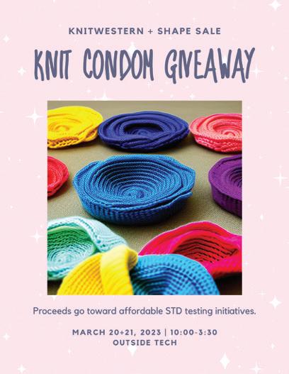 Don’t let your willy get chilly! Knitwestern and Sexual Health and Assault Peer Educators (SHAPE) will be giving away colorful, knit condoms and crochet dental dams in front of Tech for a voluntary donation. Keep things hot and steamy this winter by bundling up with some protection from the climate and chlamydia! Commissions are open for custom colors, textures and patterns. Email 9inchyarn@u. knitwestern.edu to place an order. All proceeds will go toward a ordable STD testing for students.