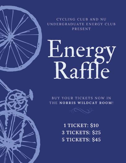 For this week only, the Cycling Club and NU Undergraduate Energy Club are selling ra e tickets in the Norris Wildcat Room. Three lucky winners* will get their mini-fridge or o -campus house powered by the exercise bikes for a week! You’ll forget all about the smell of sweat and pent-up cyclist rage when you remember what you’re doing for the environment. *Winners must bike themselves to power their own homes.