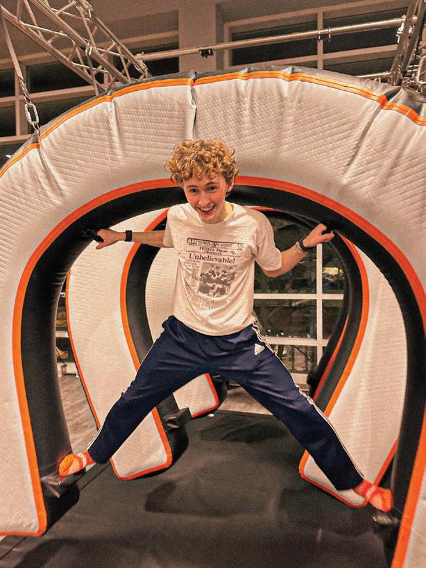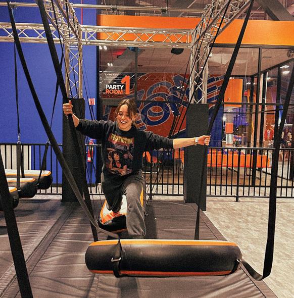 The Sky Zone archetype: felds of four-by-four foot trampolines, littered with joyful jumpers all wishing they could do a backfip. The black and orange grid called to us with a cosmic magnetism, begging us to fy between the trampoline tiles, to seek airborne moments of instantaneous elation. The Freestyle Jump is as unbeatable as MOD Pizza’s Maddy — classic, simple, never misses. Bouncing on the small but mighty plot of tramps, we took in the opulent beauty of the rest of the park from the humble attraction where Sky Zone’s empire began.