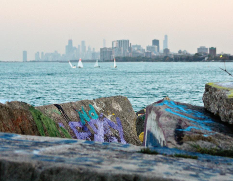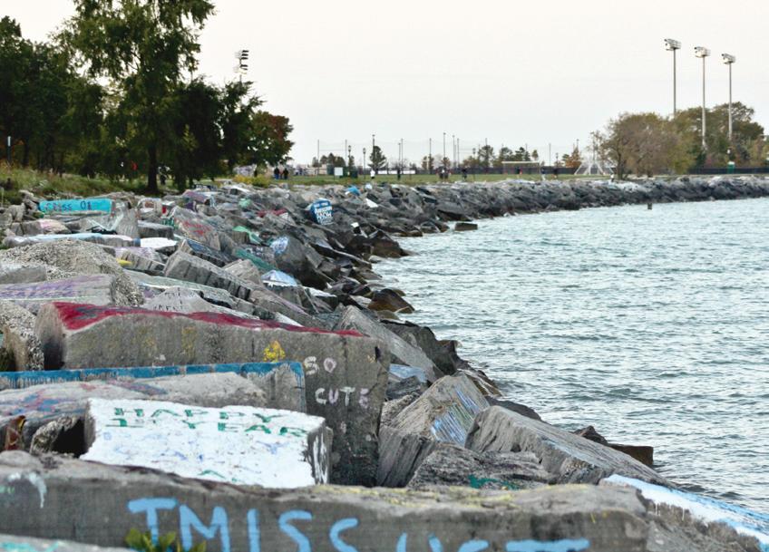 The rocks give me the duality I have in my bedroom back home. They’re where I go when I’m feeling homesick, or maybe more accurately, when I haven’t called in three weeks and feel obligated to be homesick. Sitting on the Lakefill, looking at the old love notes or inside jokes painted on the rock faces, staring out at the vast blank canvas of the lake or the city to the south that will be my home for the next three years, awash with feeling and emotion, the sound of the waves crashing and dying around me tonight – or silence. Beautiful, beautiful silence.