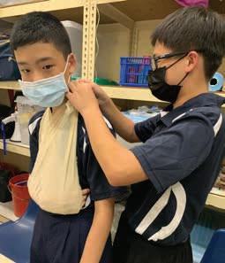 Pte Josiah Tay Eng Kiam [L] and Pte Cham Jin Long (1D) practise tying triangular bandage slings on each other. BB members learn to care for each other through the acquisition of basic First Aid skills.