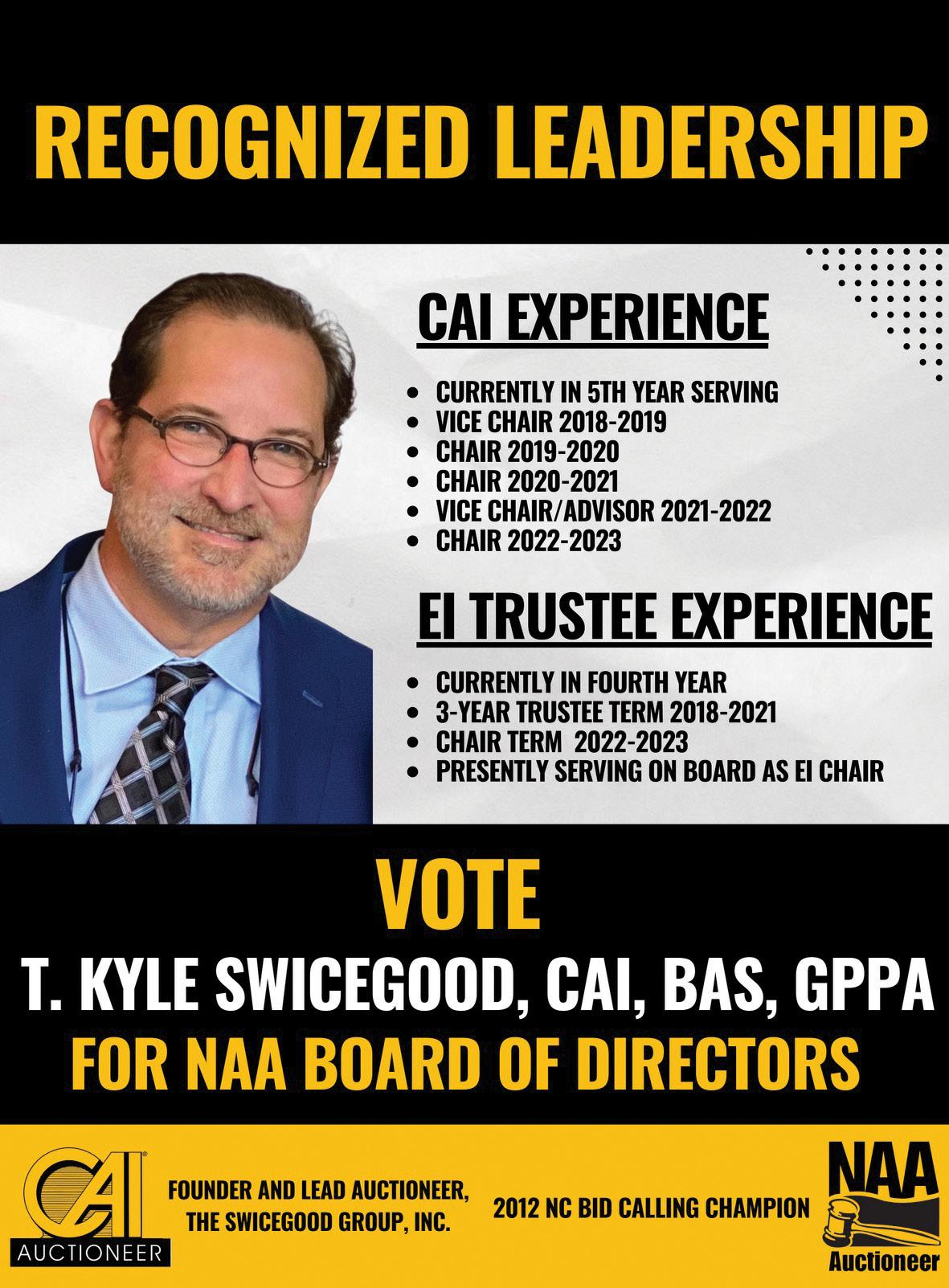 other AI tools. Just look at the changes in the Auction profession since the turn of the century in 2000—more is coming! However, what can drastically change our industry is the intervention of government laws, regulations and restrictions affecting our profession. We need to be vigilant and proactive and not reactive when possible. Get to know the political people in your area on the national, state and local levels and have a personal relationship with them. It is not a matter of whether will we need those relationships to protect our profession, but when! Unfortunately, most politicians don’t understand what we do or the problems we face unless you let them know. Our recently formed PAC and political watchdog group are our first great steps in that direction. The NAA can’t do it all: we need you (our membership) and your personal relationships with politicians in your area. If you are not sure what or how to begin or how to improve your political relationships, we will teach you how to approach and establish a working relationship with your senators and representatives.