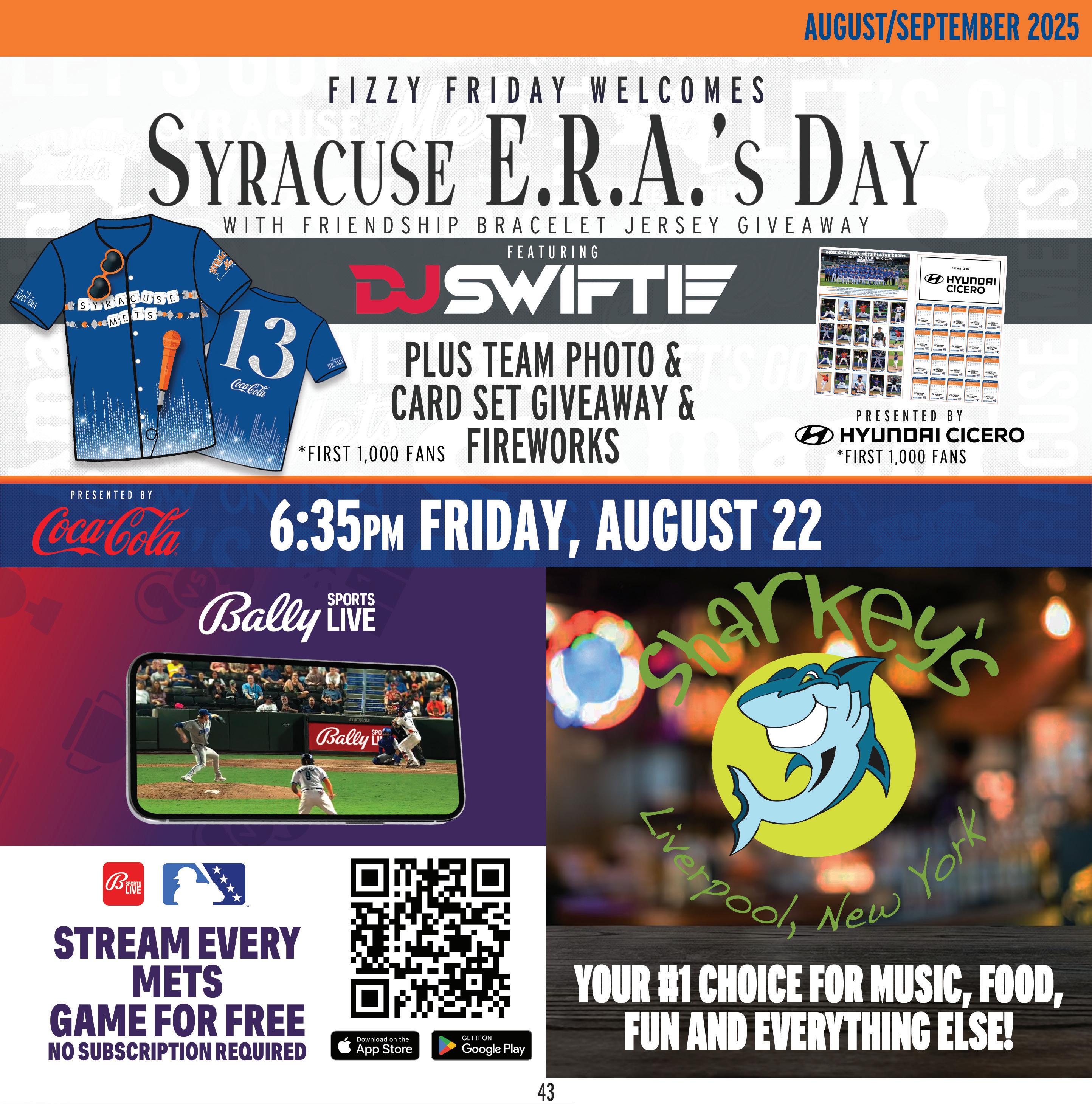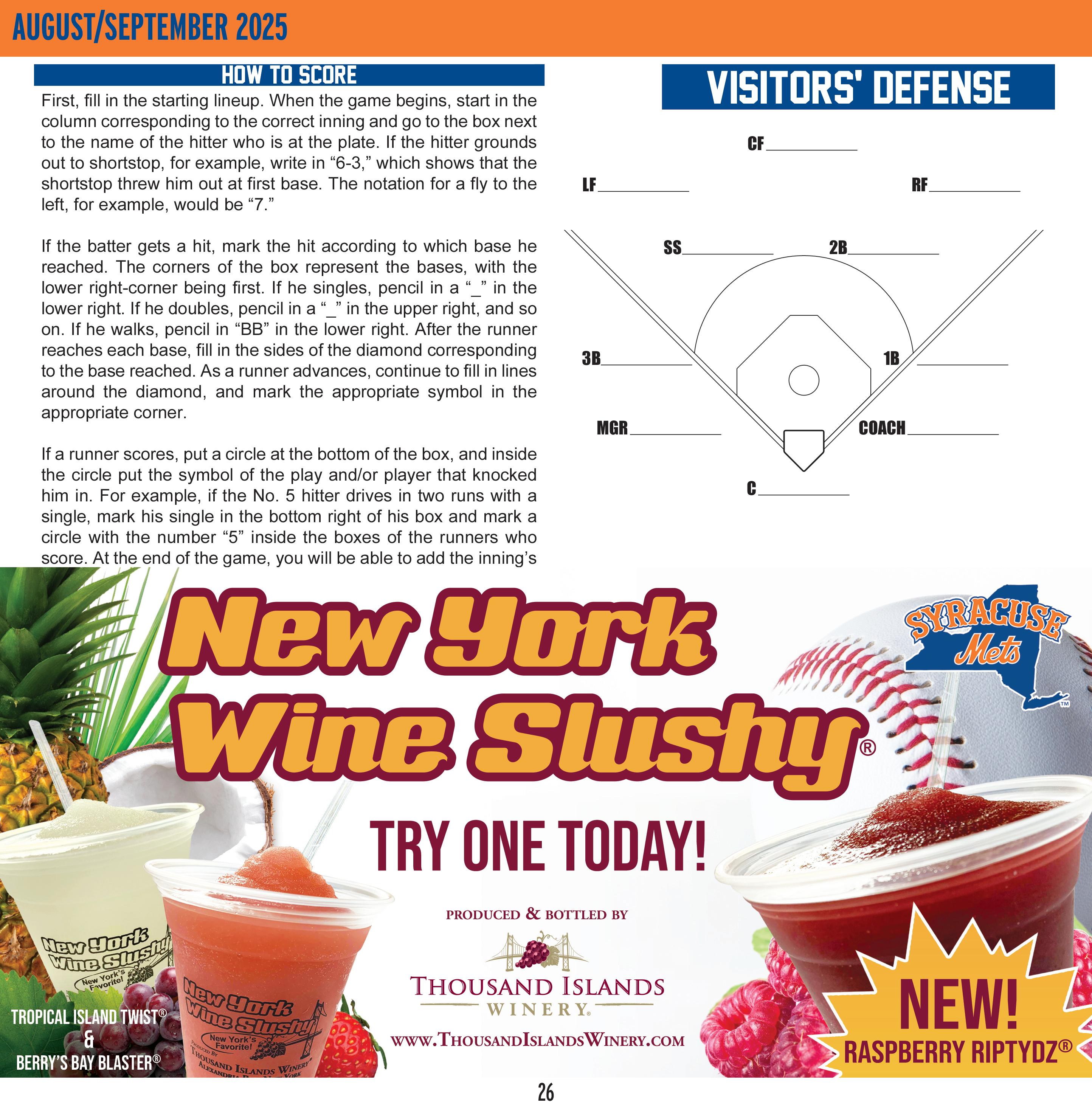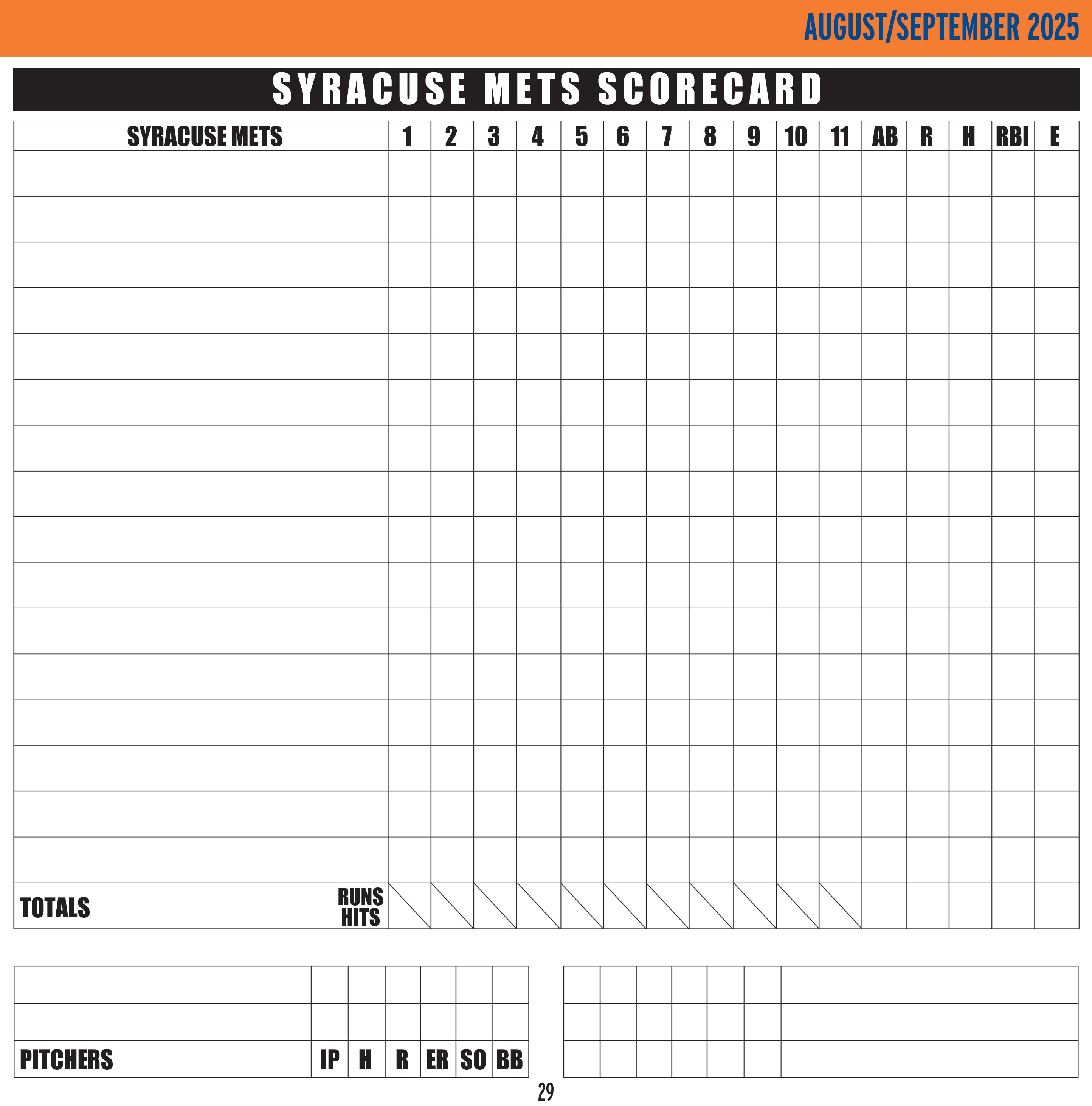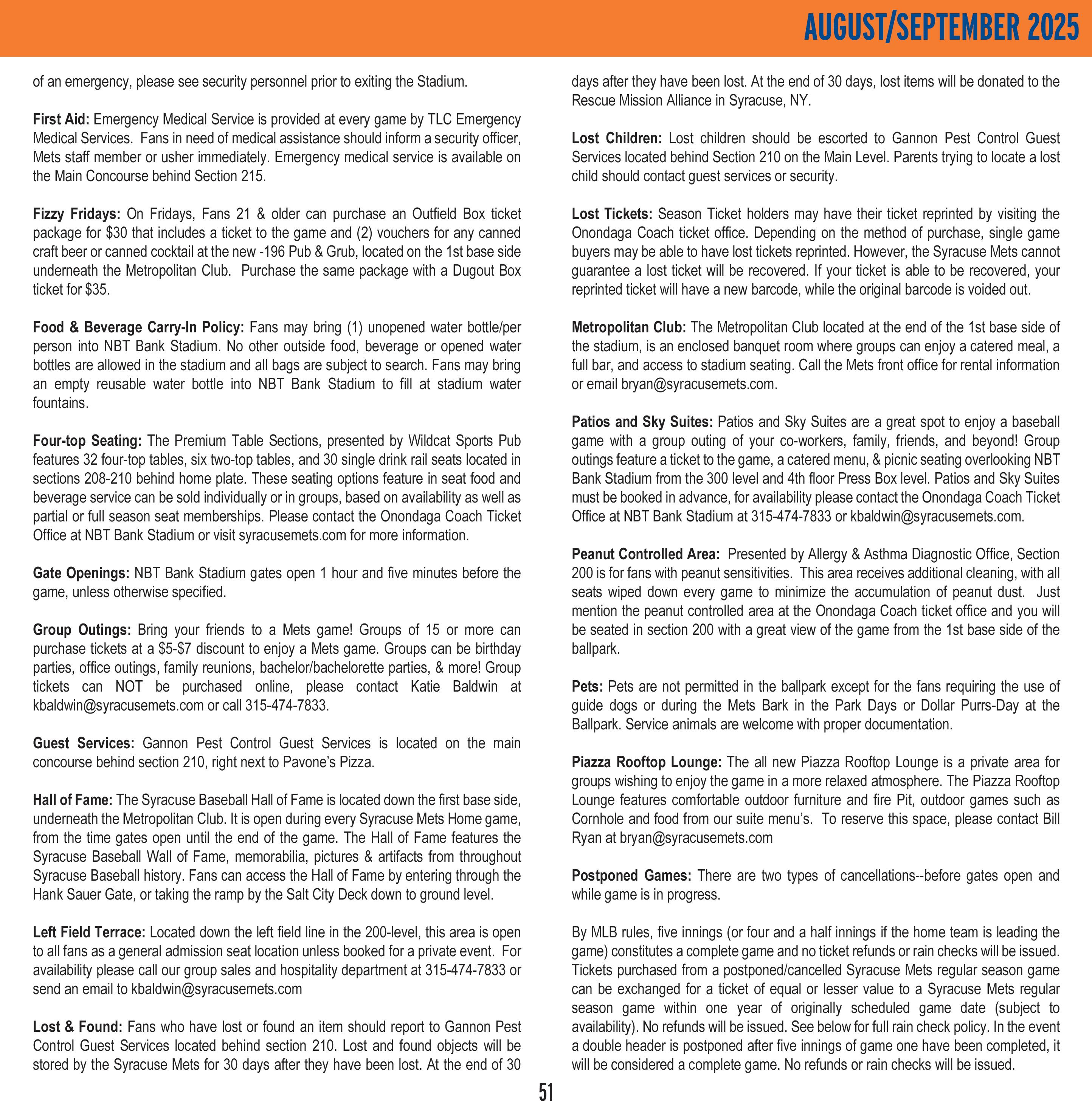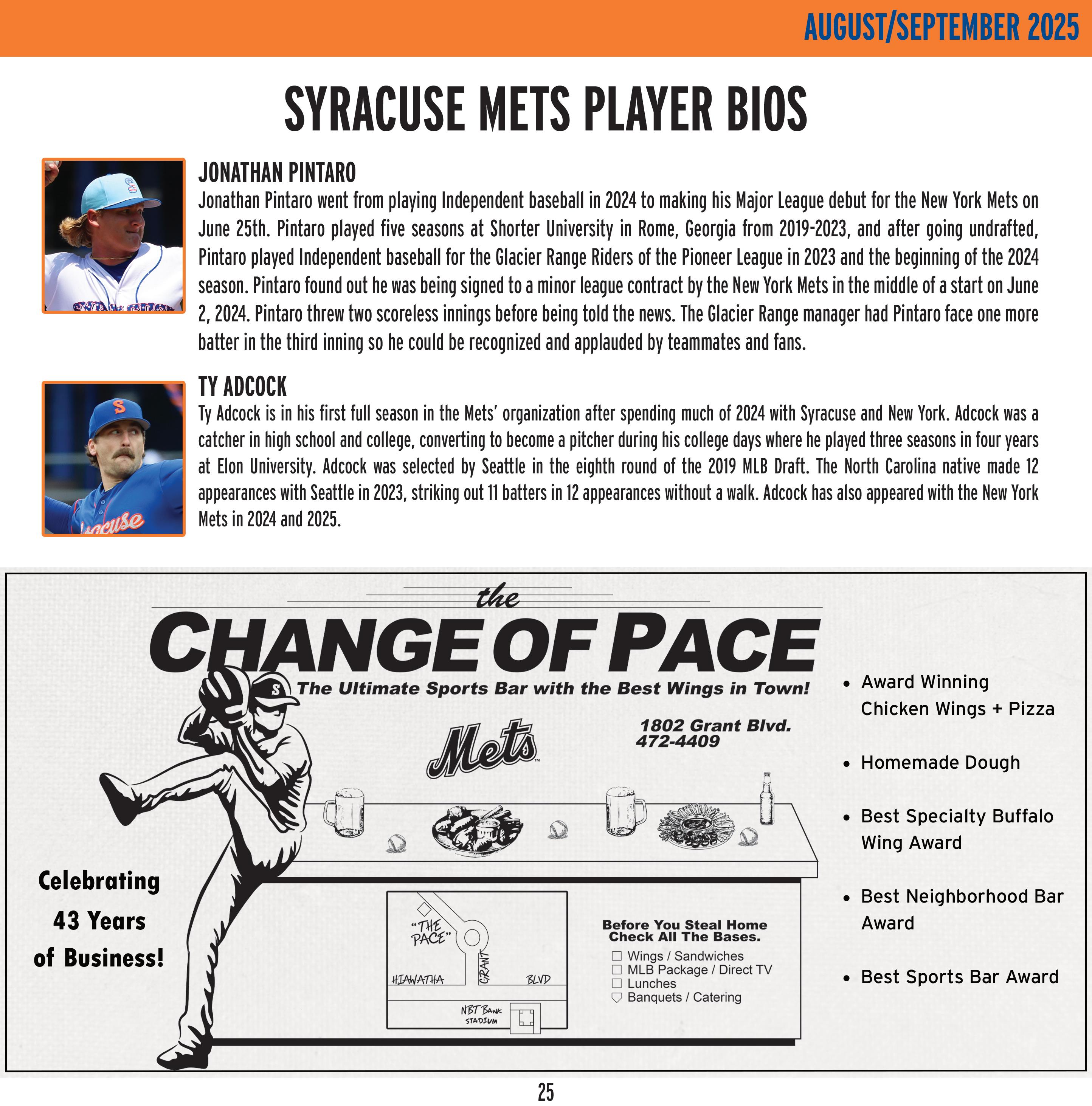 Welcome to the Syracuse Mets August/September 2025 Gameday Program! Dive into the ultimate fan experience with our comprehensive guide. Inside, you'll find player bios that highlight some of the stars of our team, exciting promotional information to keep you in the loop on all the fun events, and the 2025 schedule so you never miss a game. Our A-Z guide covers everything you need to know about the stadium and game day logistics. Plus, keep track of the action with our scorecard and much more.