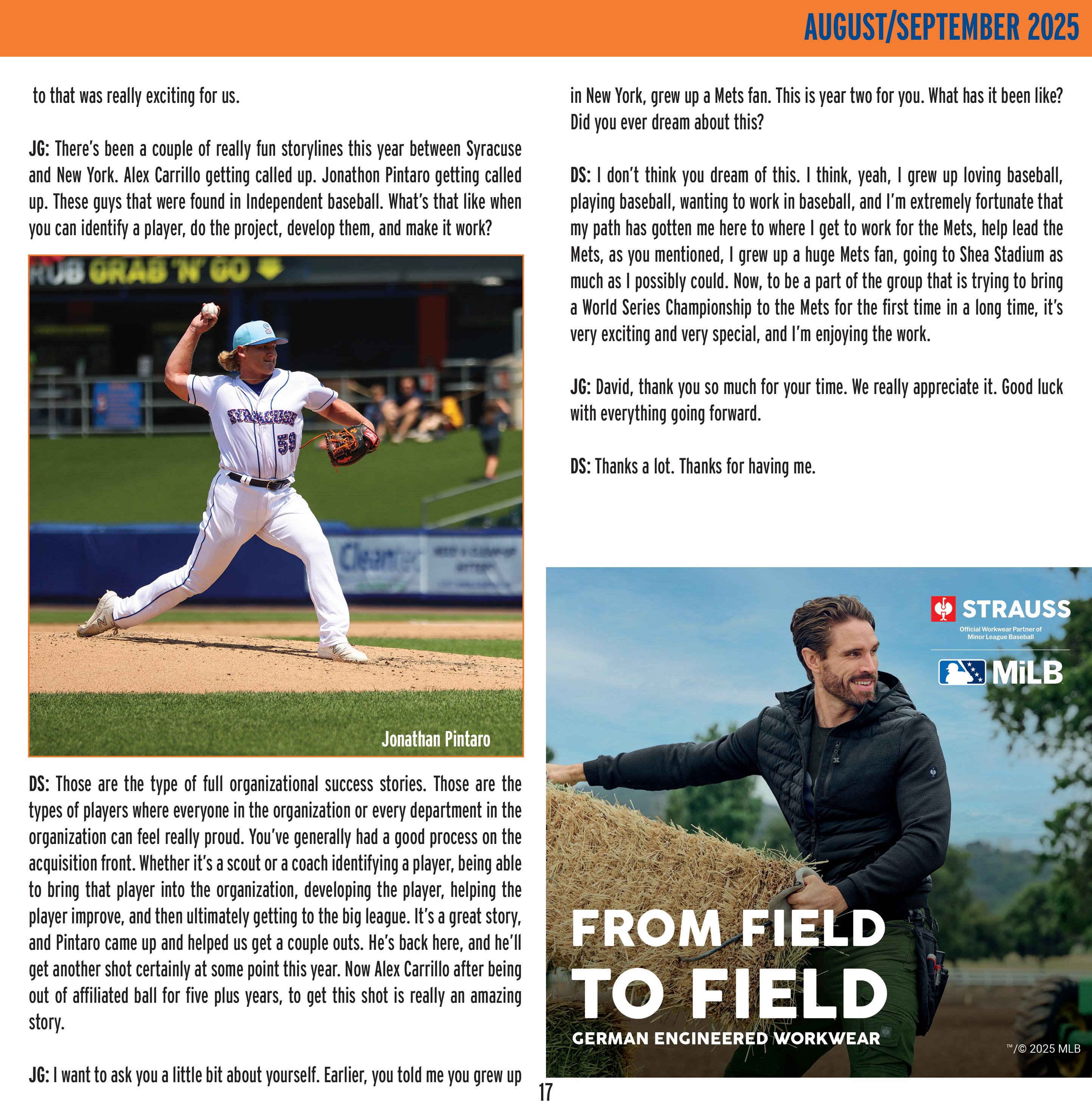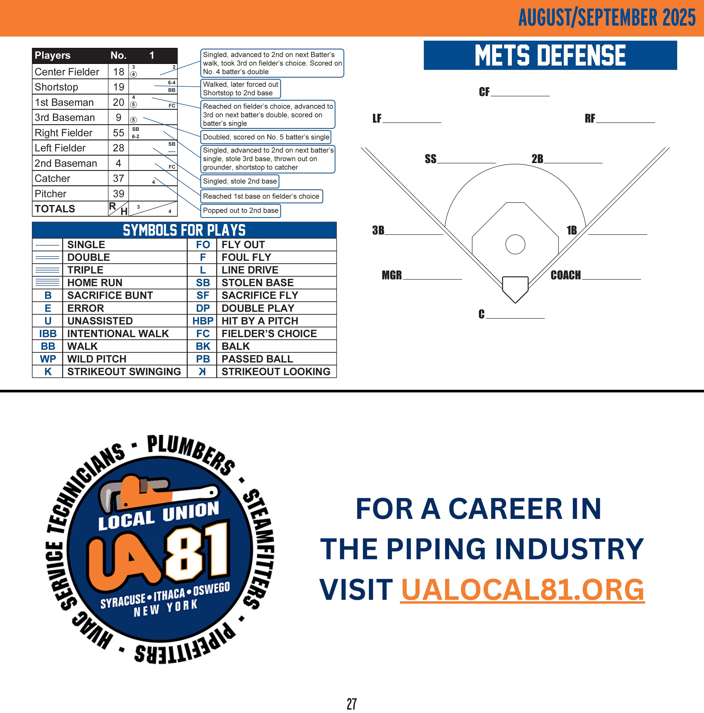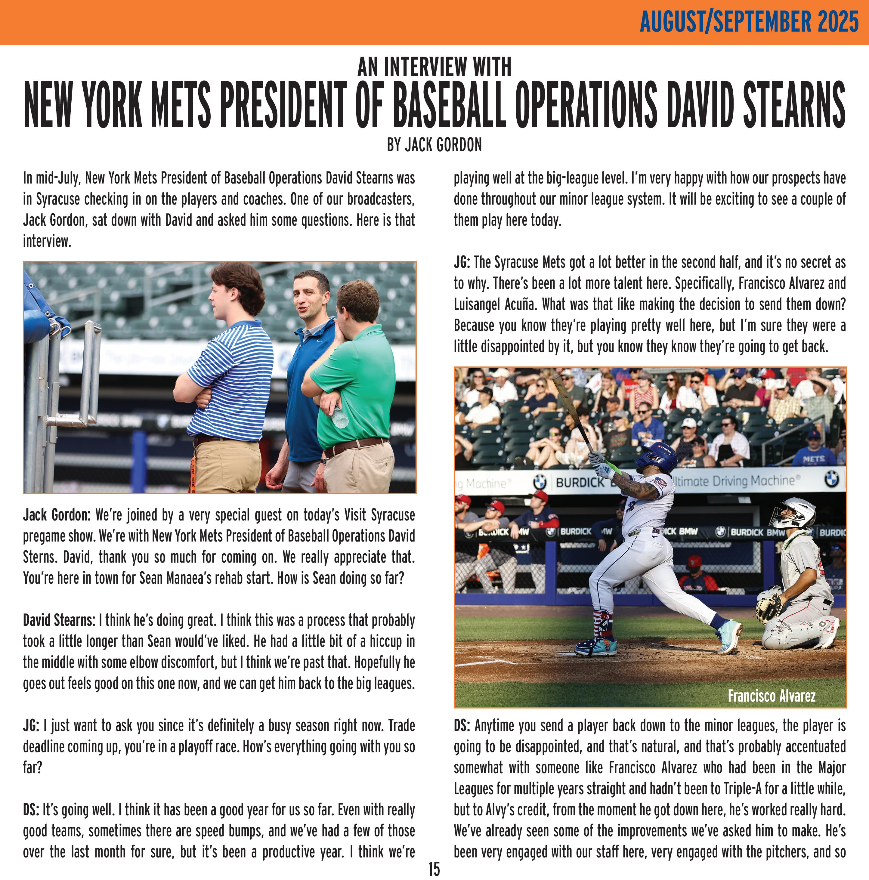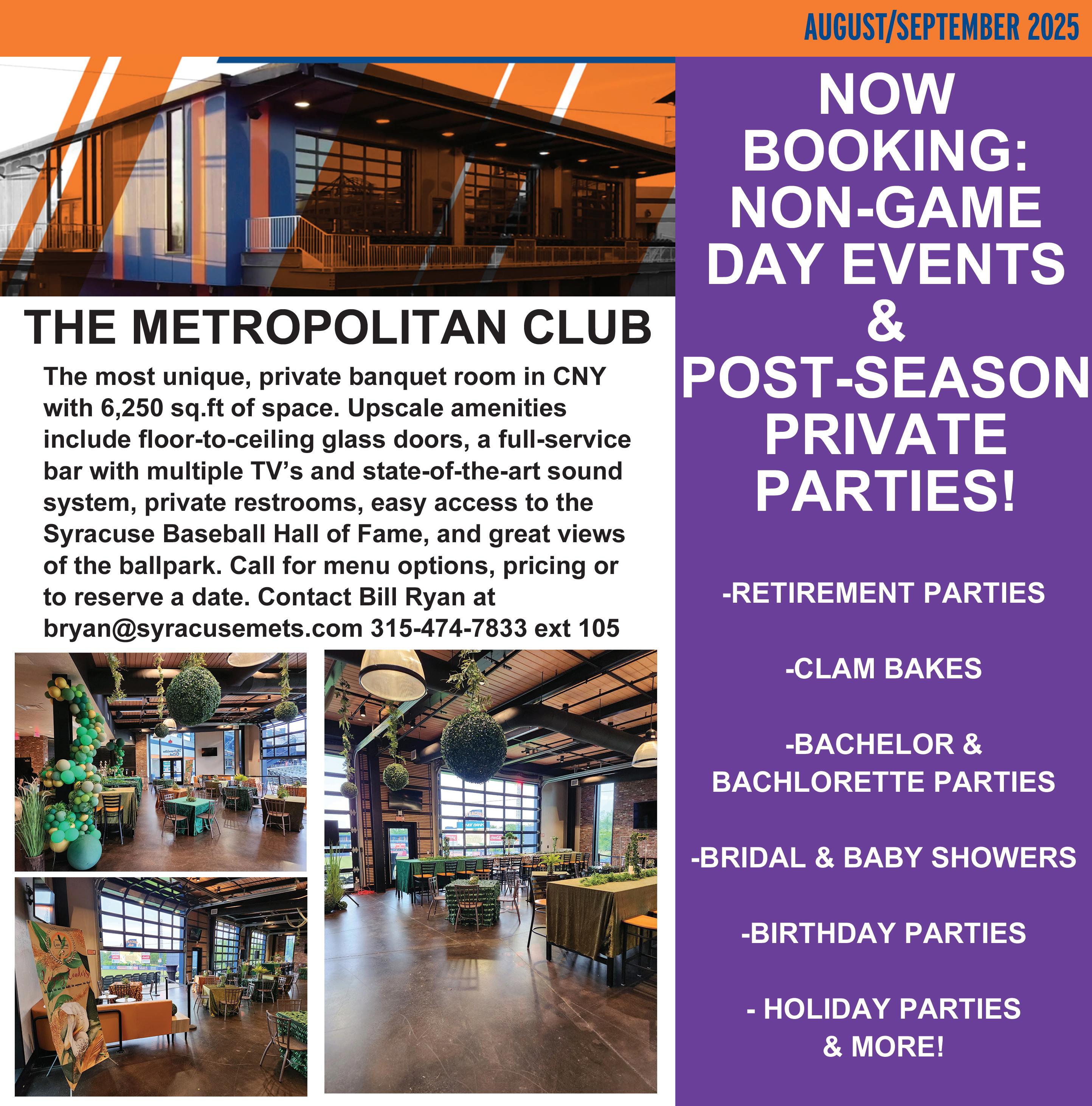 Welcome to the Syracuse Mets August/September 2025 Gameday Program! Dive into the ultimate fan experience with our comprehensive guide. Inside, you'll find player bios that highlight some of the stars of our team, exciting promotional information to keep you in the loop on all the fun events, and the 2025 schedule so you never miss a game. Our A-Z guide covers everything you need to know about the stadium and game day logistics. Plus, keep track of the action with our scorecard and much more.